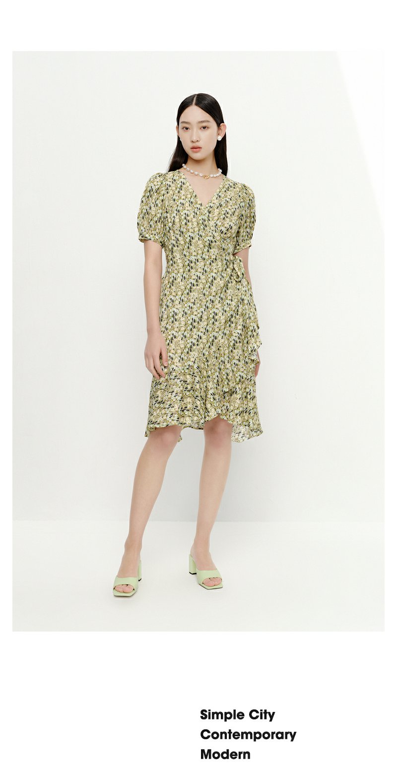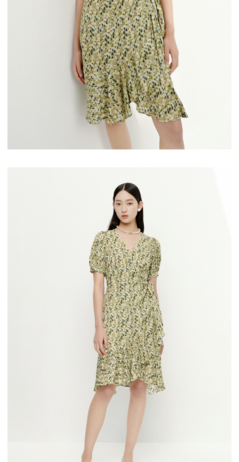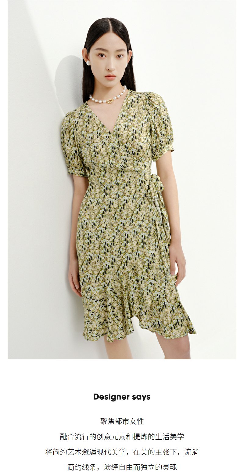 NEELLY纳俪商场同款V领泡泡袖碎花连衣裙女系带收腰不规则A字裙N23051Y01125