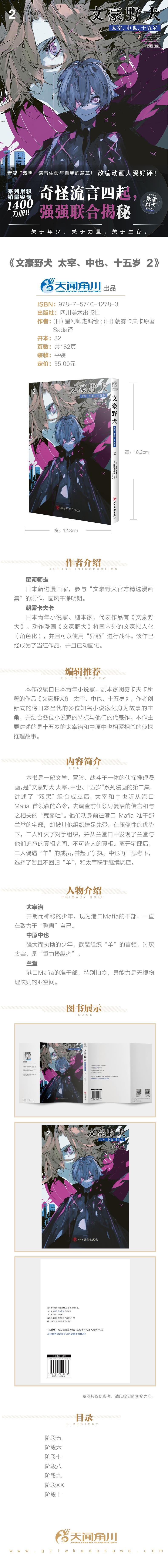 分则各自为王,合则天下无双,青涩“双黑”强强联手,揭秘奇怪传言背后的真相!“文豪野犬”系列销量累计突破1400万册!本作改编自日本青年小说家、剧本家朝雾卡夫卡所著的作品《文豪野犬6 太宰、中也、十五岁》,作者创新式的将日本当代的多位知名小说家化身为故事的主角,并结合各位小说家的特点与他们的代表作。本作主要讲述的是十五岁的太宰治和中原中也相爱相杀的侦探推理故事。