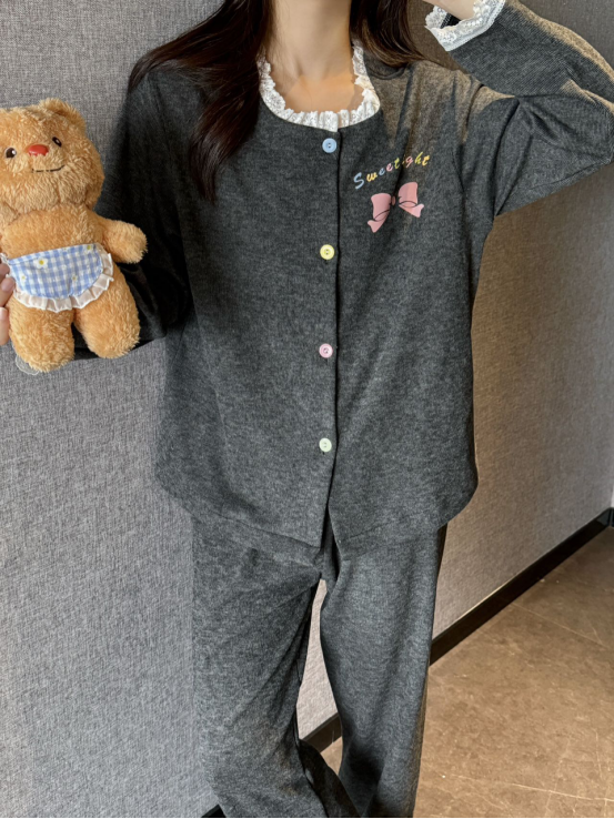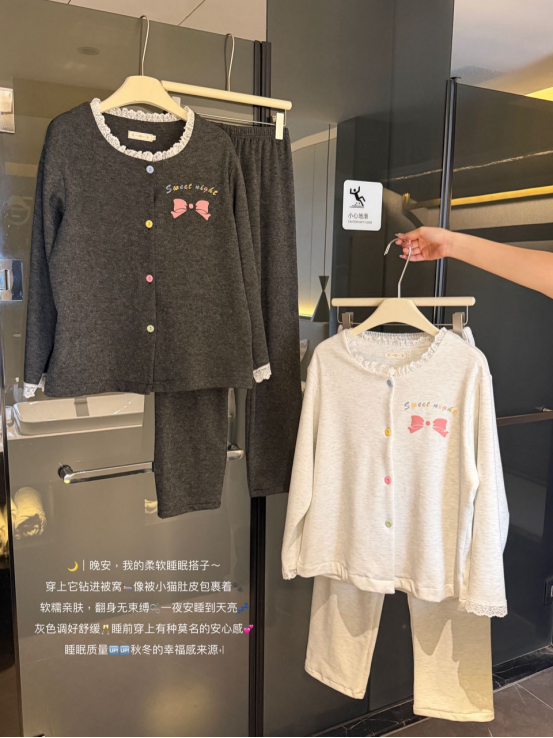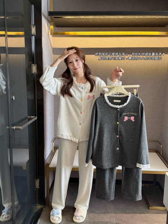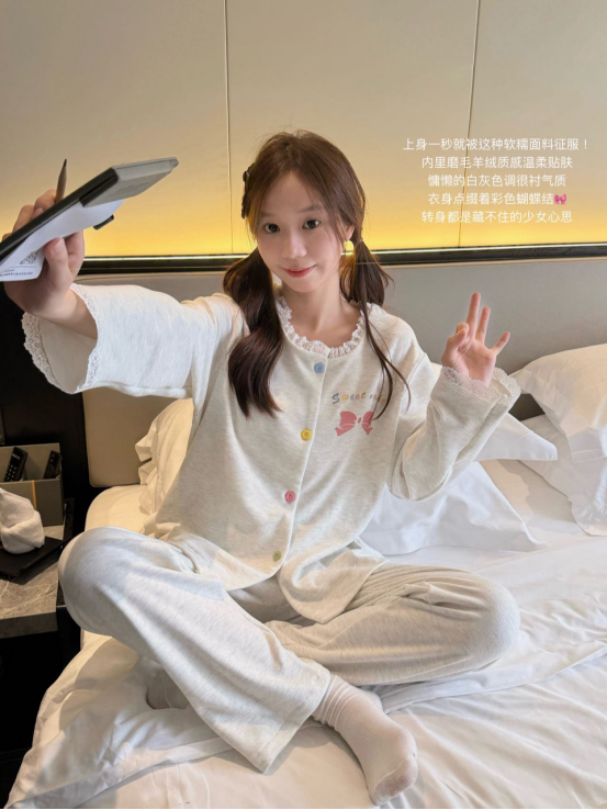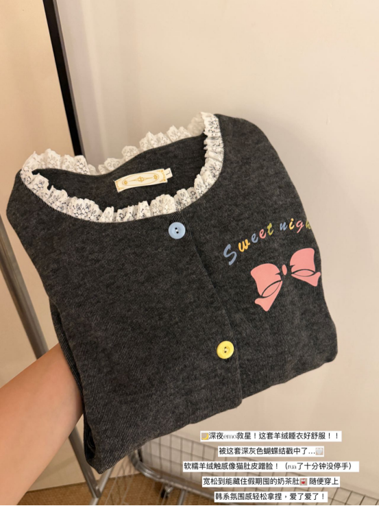 🐾允许秋冬宅家自己瘫成一只幸福的棉花糖,宅家幸福感清单TOP1——必须是这套软fufu的睡衣! 🌙深夜emo救星!这套羊绒睡衣好舒服!! 被这套深灰色蝴蝶结戳中了…🤍 软糯羊绒触感像猫肚皮蹭脸!(rua了十分钟没停手) 宽松到能藏住假期囤的奶茶肚🥤 随便穿上 韩系氛围感轻松拿捏,爱了爱了!
