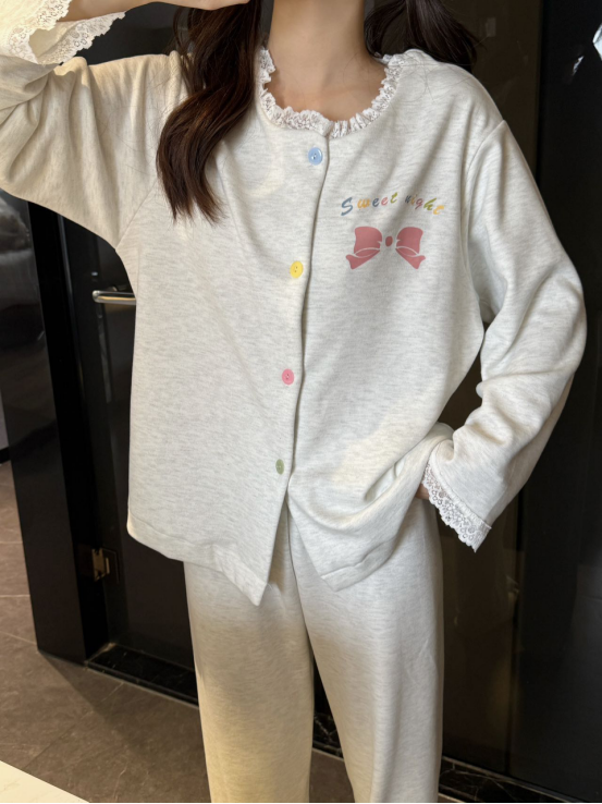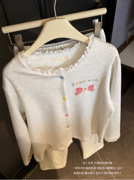 🐑双面磨毛羊绒睡衣 | 把家穿成温柔港湾 这个秋冬 只想被软糯包裹 一抹纯净的温柔色调 搭配甜心蝴蝶结🎀设计 剪裁利落 蕾丝领口 包边干净利落有调性🥂 无需刻意摆拍 自带温柔滤镜🫧