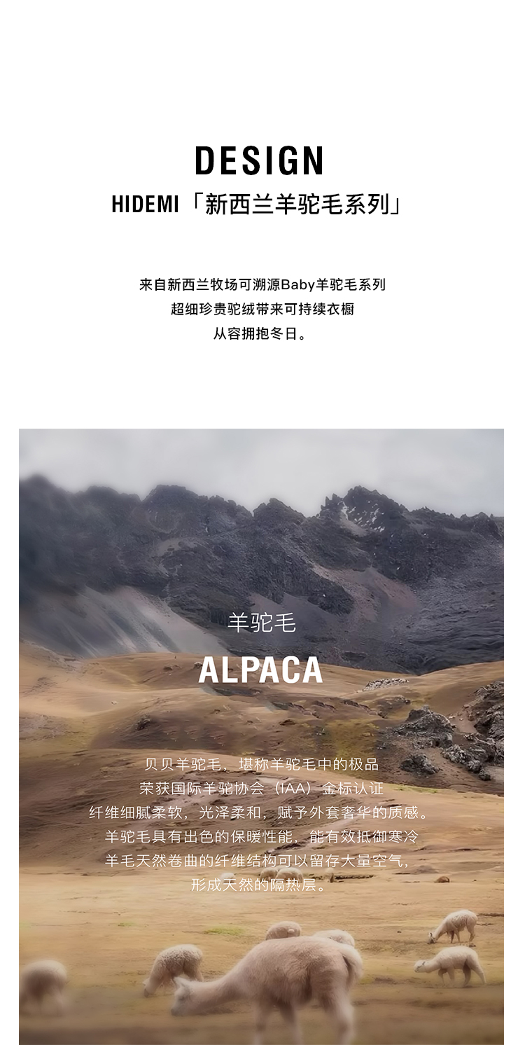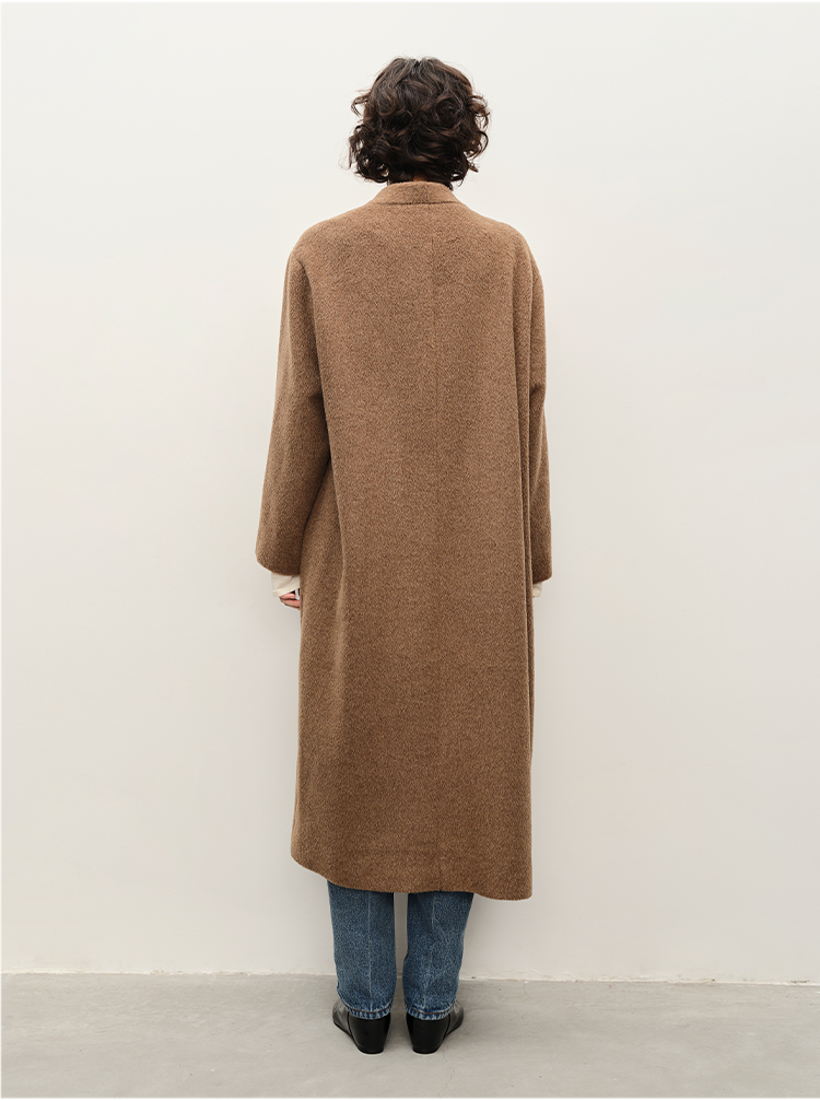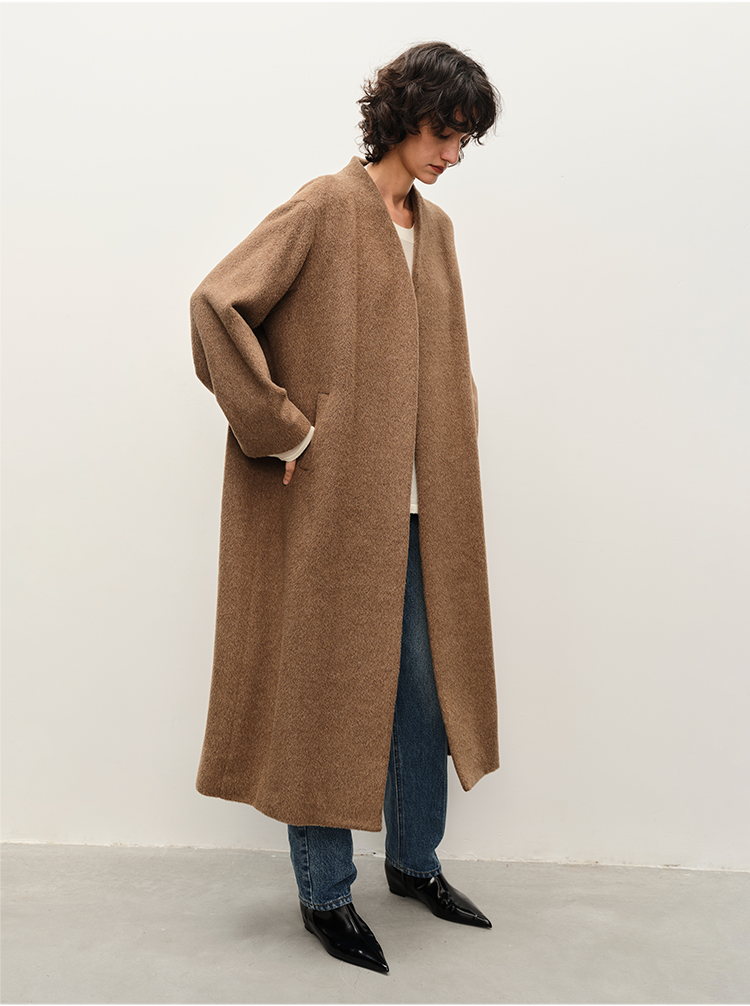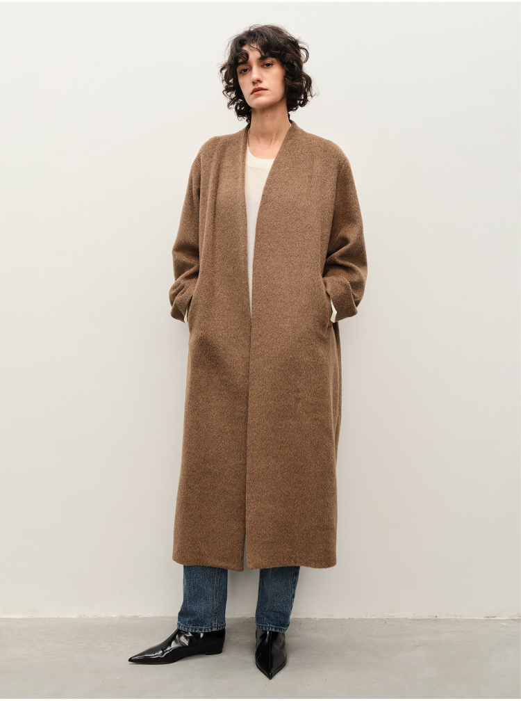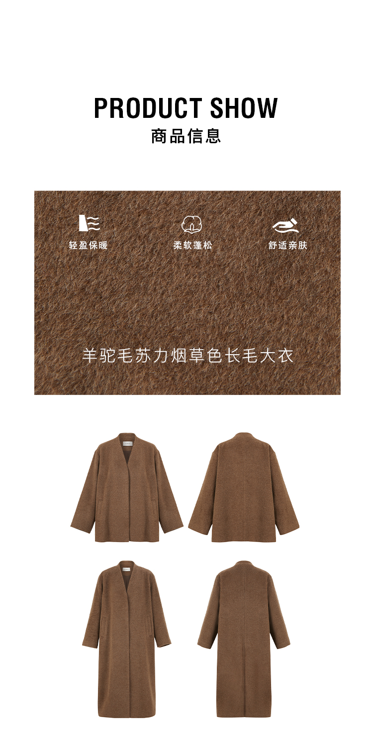 HIDEMI alpaca羊驼毛苏力烟草色长毛v领极简设计感大衣 长款/短款