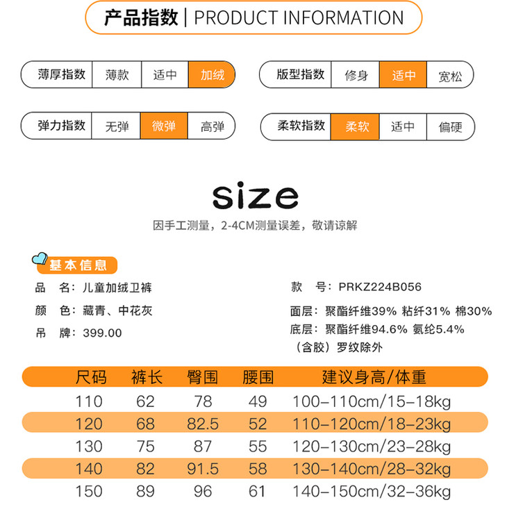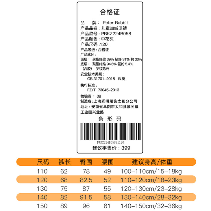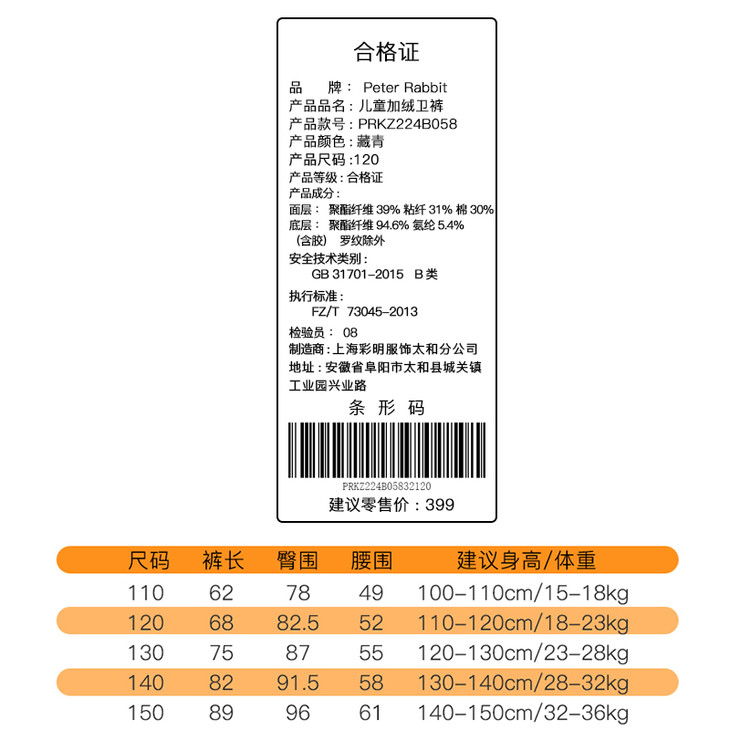 ⁴ 微瑕清仓99元任选2件【比得兔儿童秋冬加绒卫裤】适110-150码 YC04-BDT