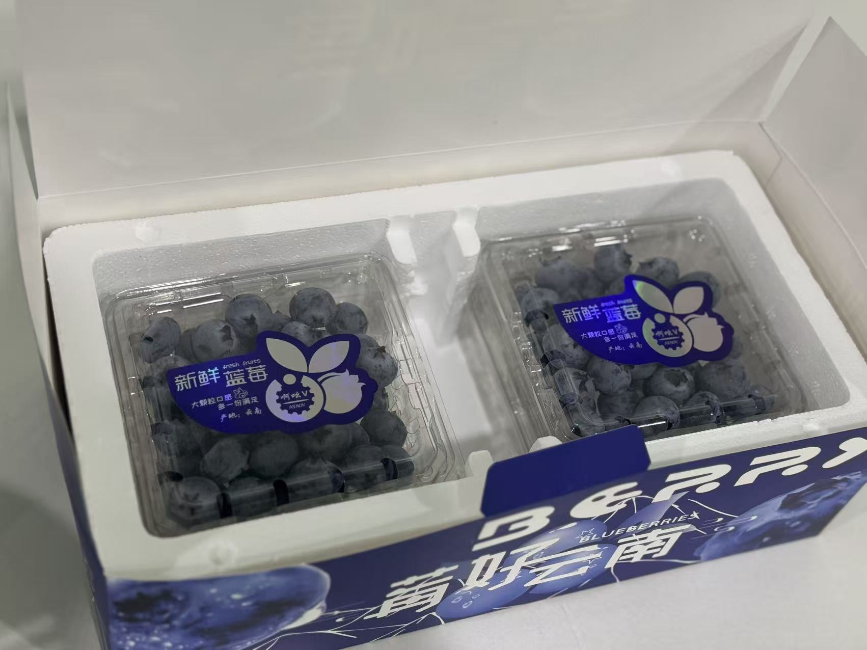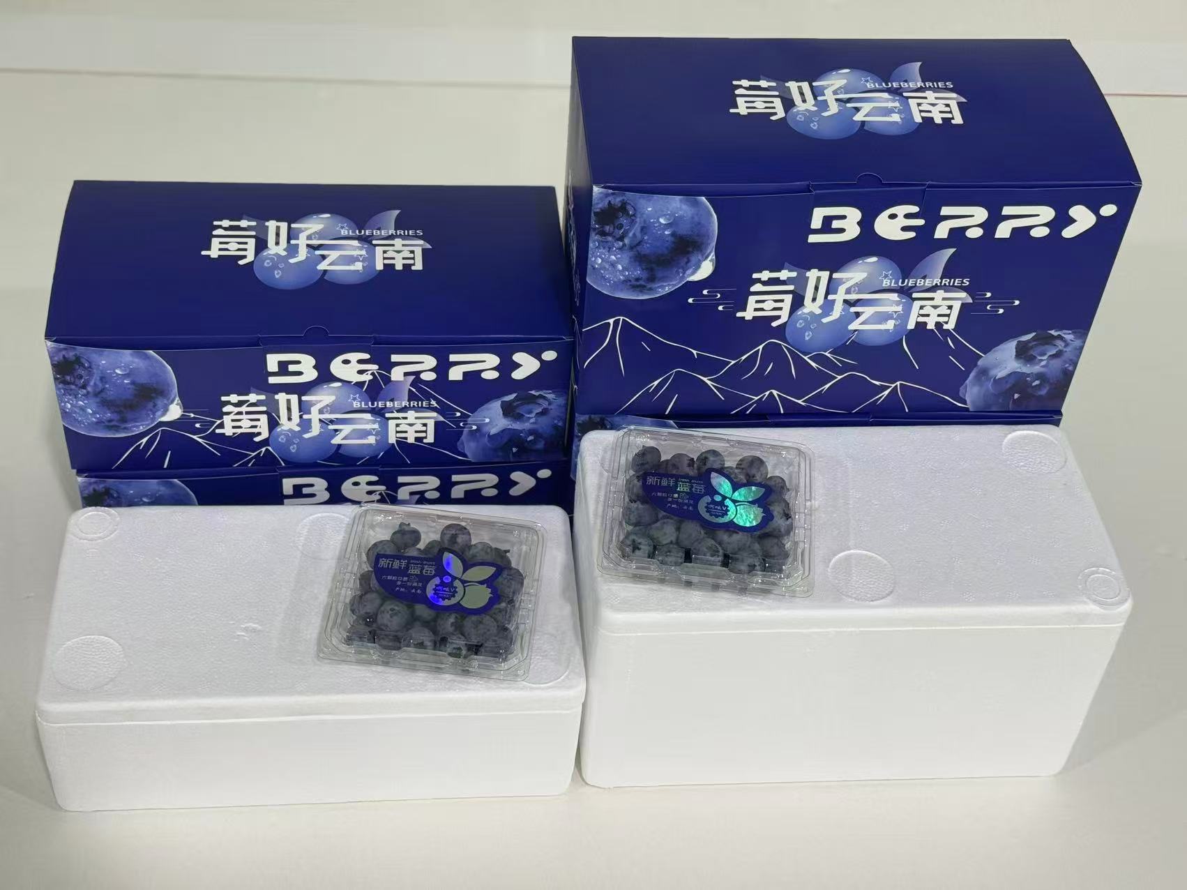 【品名】云南L25花香蓝莓【口感】香甜爽口、果香浓郁、【规格】保鲜箱四盒/八盒装(125g/盒)中果果径15mm+大果果径18mm+特大果果径22mm+