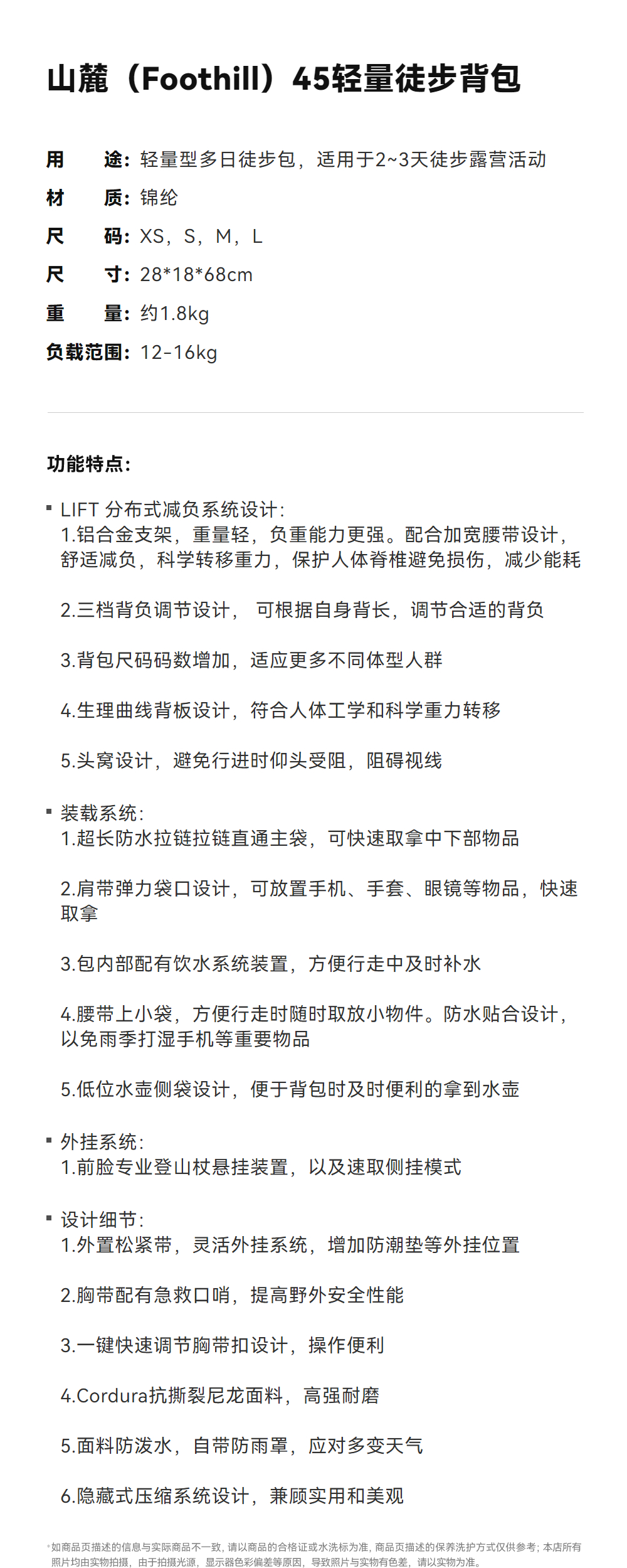 KAILAS凯乐石 户外运动 山麓(Foothill)45轻量徒步背包 KA2453004