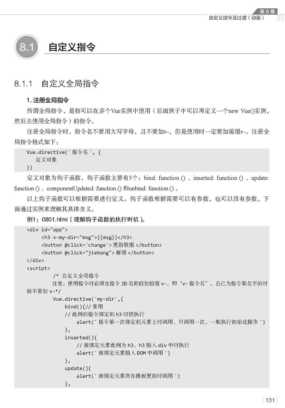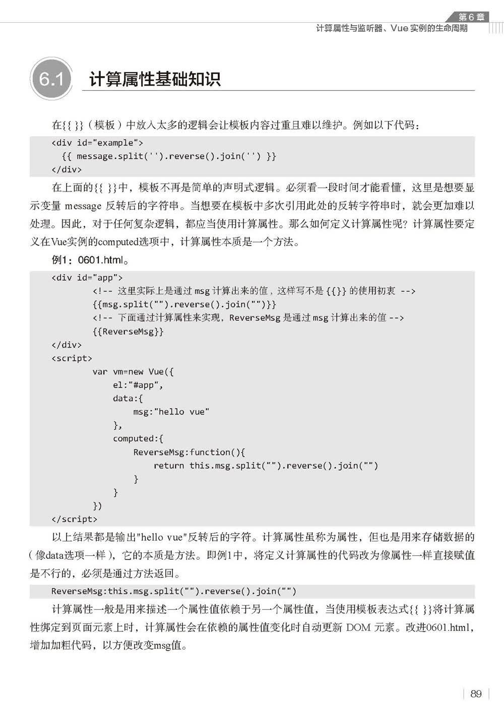 第2篇为基础核心案例篇,主要讲解Vue.js基础核心内容,包括Vue.js的核心思想、MVVM框架、常用指令、事件修饰符、按键修饰符、系统修饰符、计算属性、监听器、Vue实例生命周期等。掌握好这些内容就能初步使用Vue进行开发,同时也为进一步深入学习Vue奠定坚实基础。