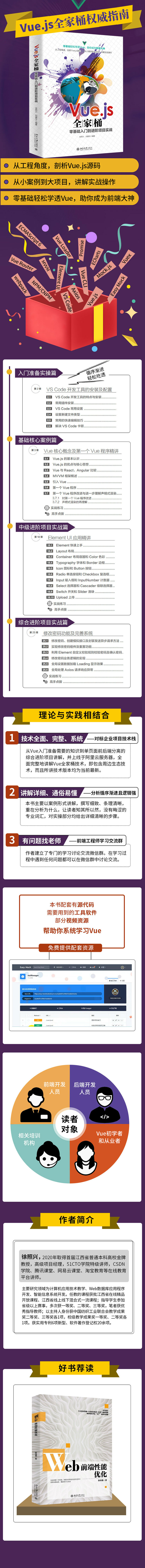 本书适合前端开发人员、后端开发人员阅读,包括:在校生,需要掌握流行的新技术,做到与职场同步;在职人员,需要系统全面高效使用Vue技术。