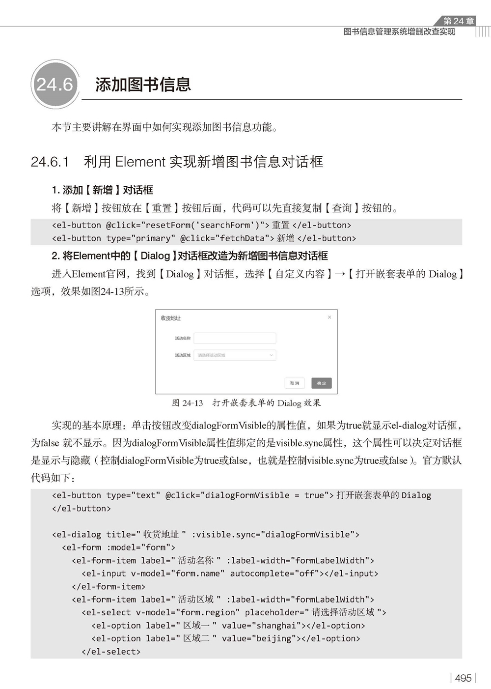第4篇为综合进阶项目篇,主要以开发图书信息管理系统为例,讲解单页面前端与后端分离项目的开发,主要用到的技术包括Vue.js、Vue CLI、webpack、Vue Router、Axios、Vuex、Element、Easy Mock、ECharts。综合运用Vue及周边生态技术进行单页面前端与后端分离项目开发,全面巩固加深对Vue.js的理解,最后实现上线部署。