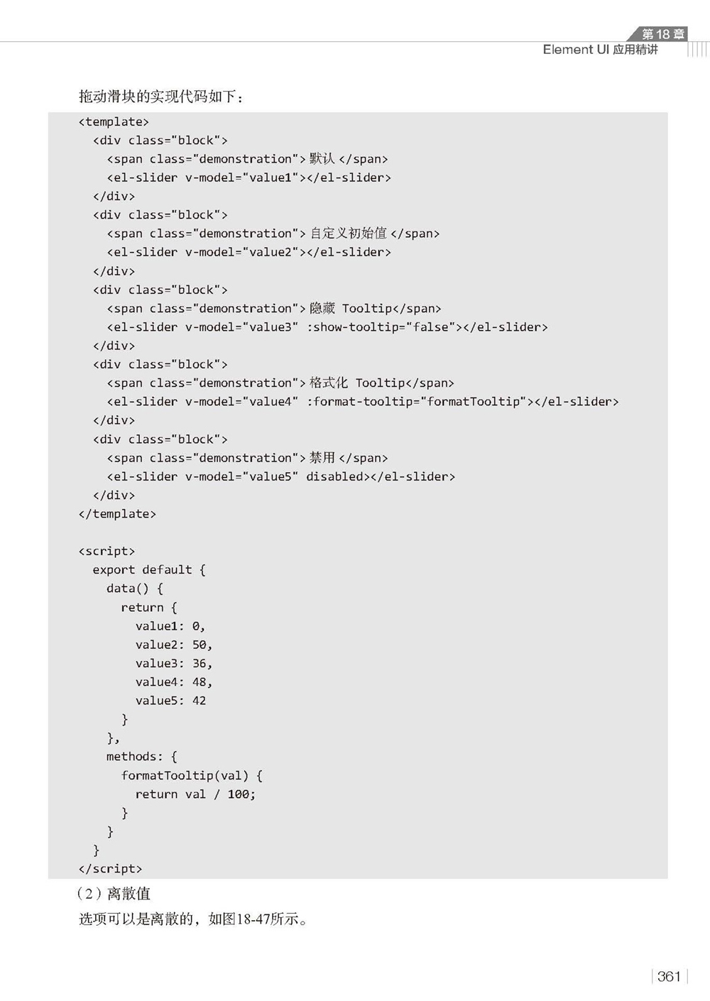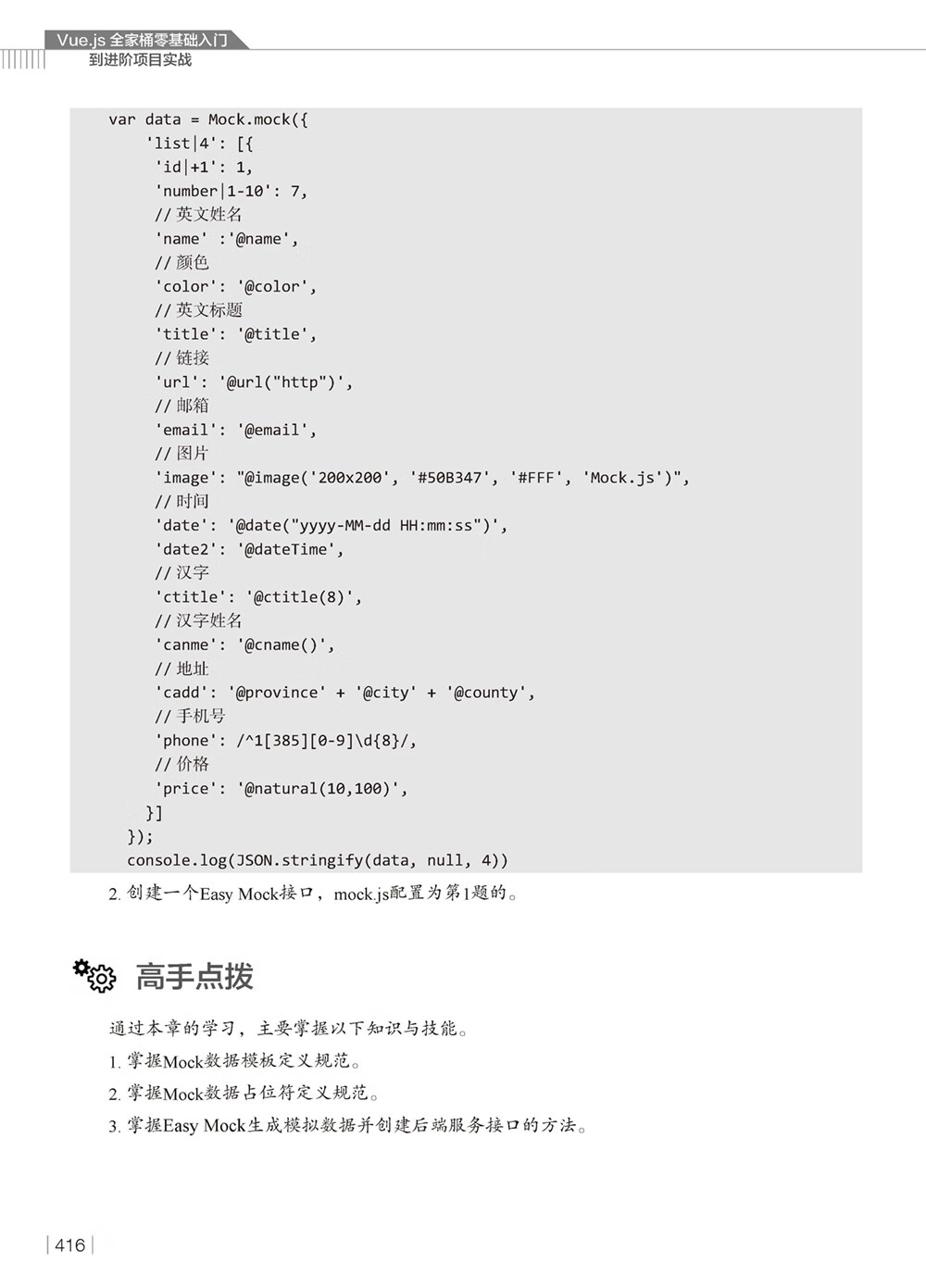第3篇为中级进阶实战篇,主要讲解Vue实例常用属性和方法、自定义指令、自定义过滤器、过渡、开发插件、组件及组件间的通信、使用Axios发送HTTP请求、使用Vue Router实现路由控制,使用webpack打包工具的方法、ECMAScript 6的语法、webpack与各种插件的配合使用、Vue CLI脚手架的搭建、Element UI的应用、Vuex的应用、Mock和Easy Mock的应用。掌握好上述内容,可助力读者全面理解Vue及其周边生态技术,并能够应用到项目中。