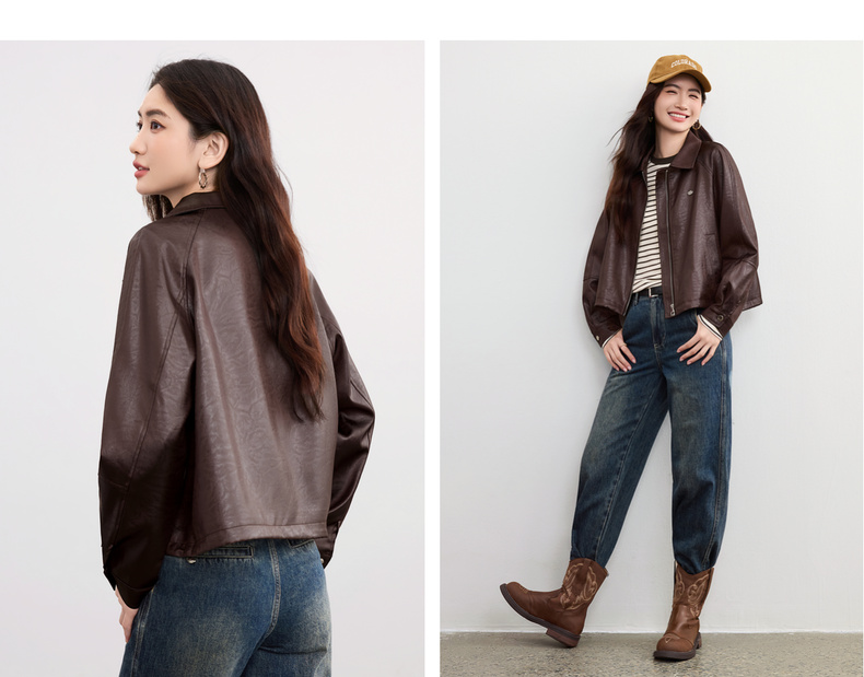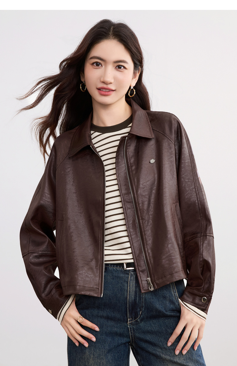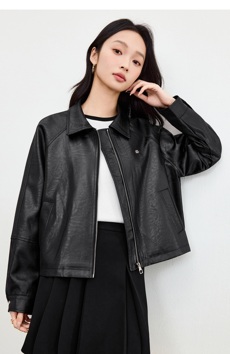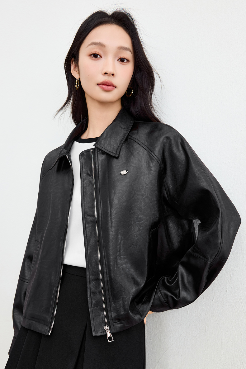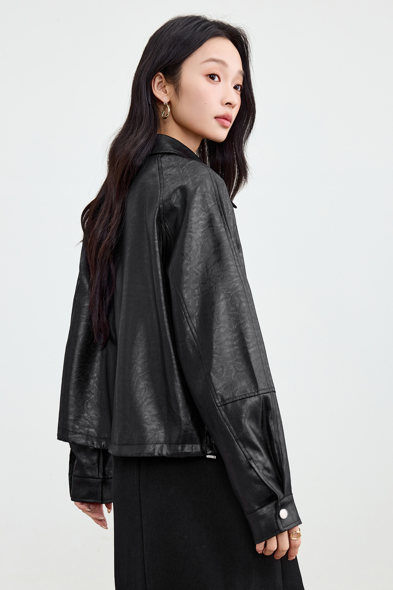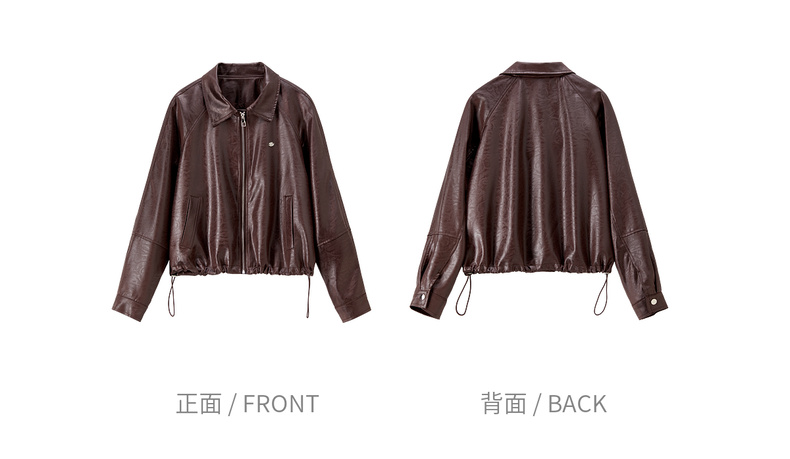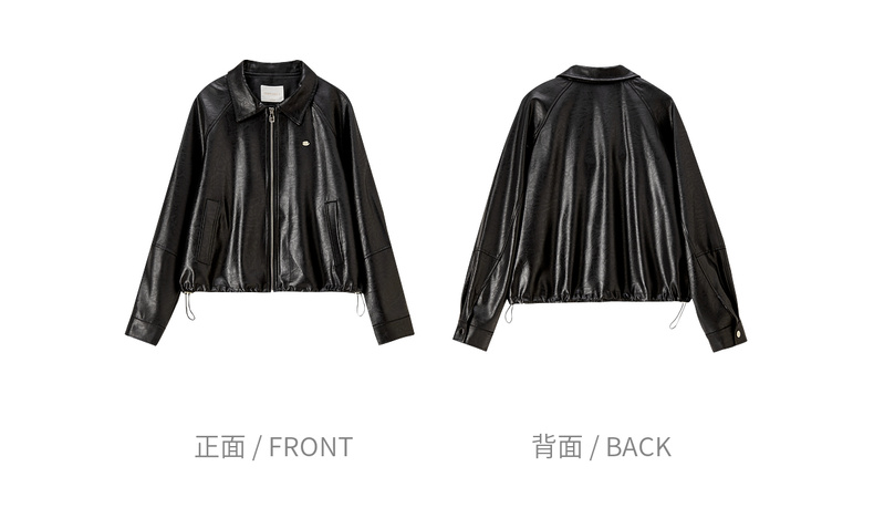【内购】【皮质手感肌理】翻领金属拉链下摆抽绳光泽感宽松插肩长袖外套-W53WB3506