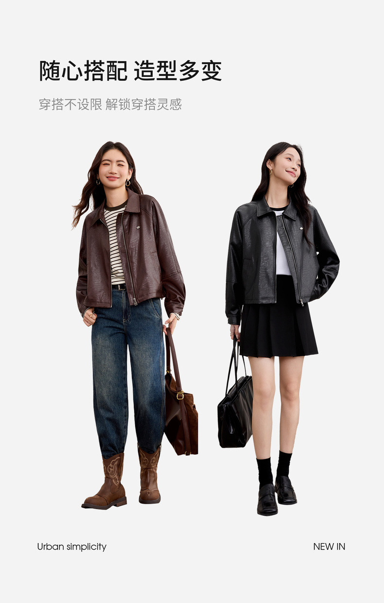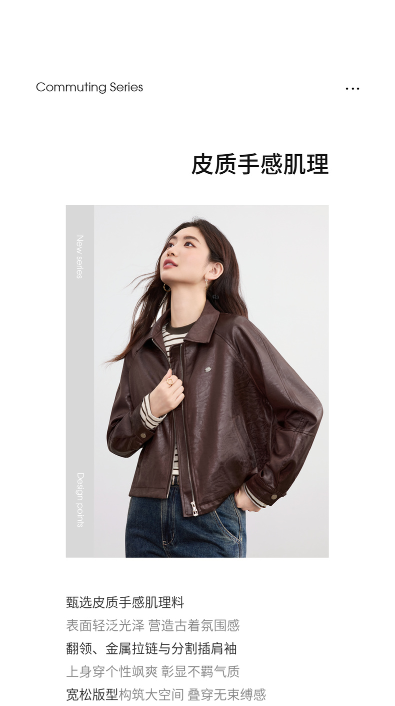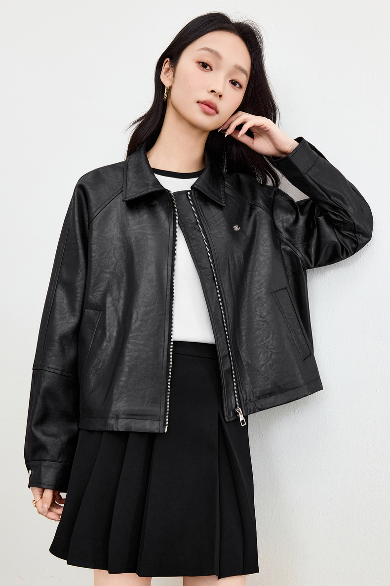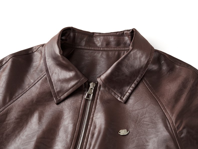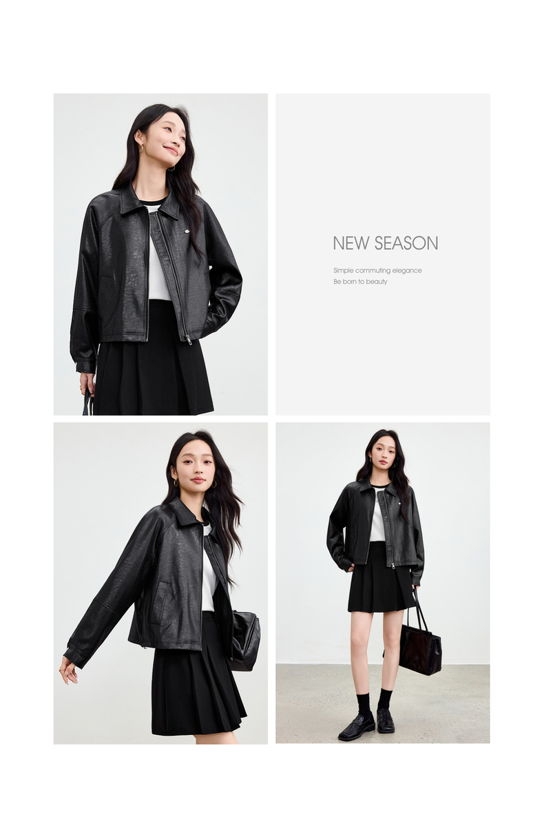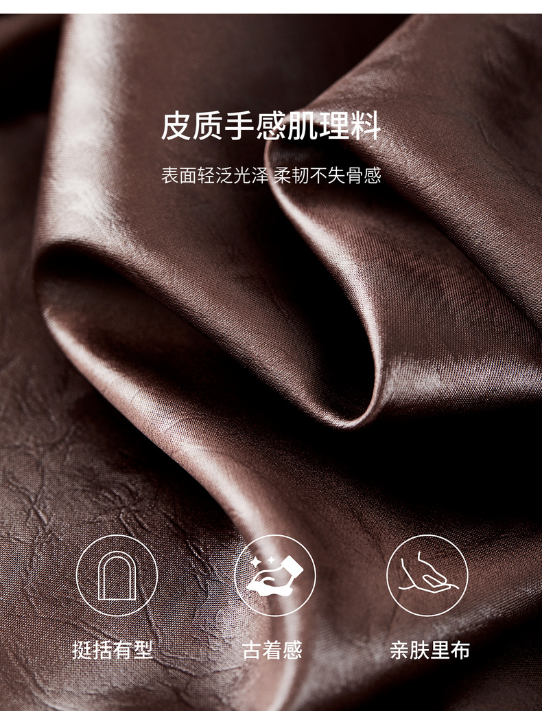 【内购】【皮质手感肌理】翻领金属拉链下摆抽绳光泽感宽松插肩长袖外套-W53WB3506