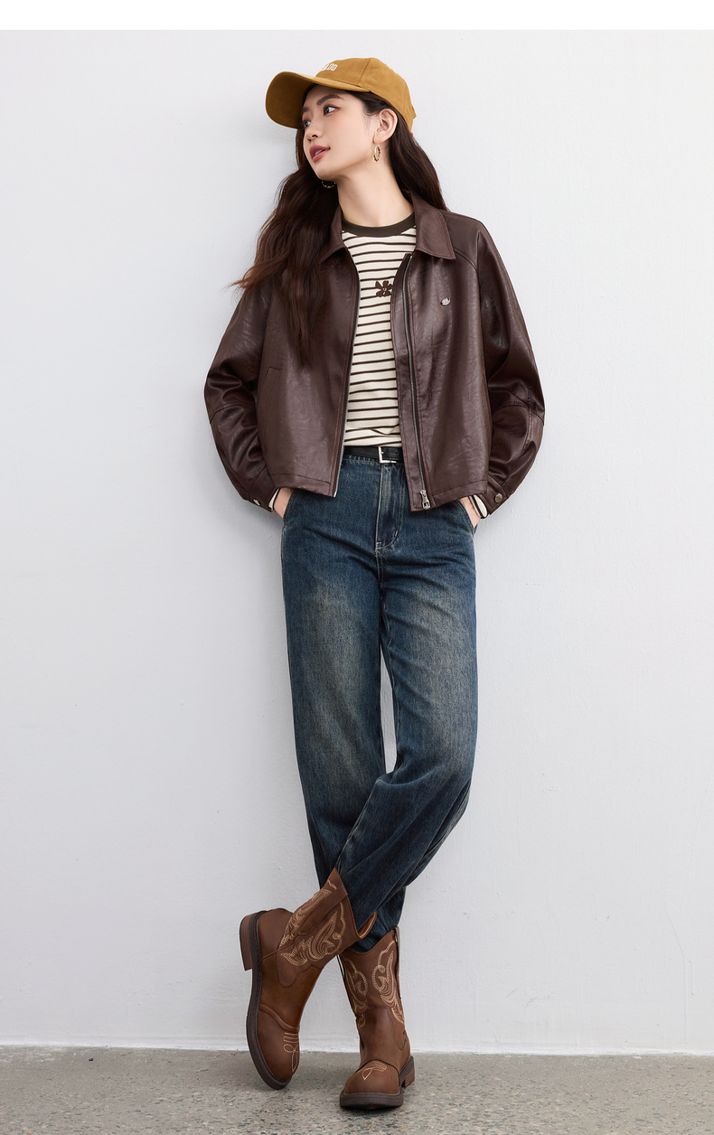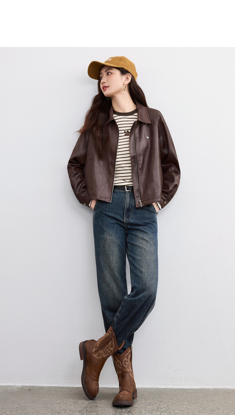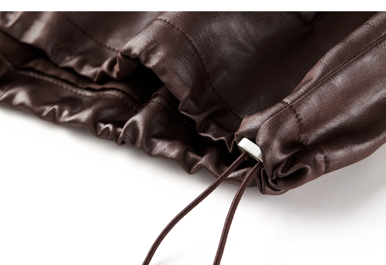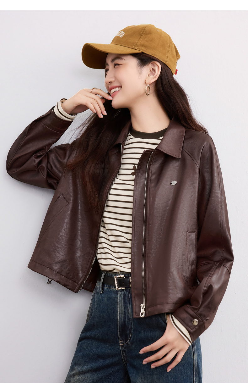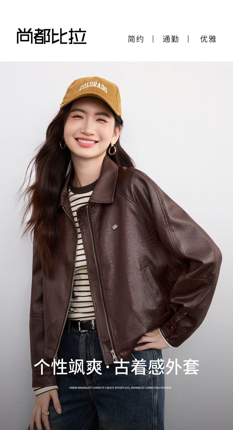 【内购】【皮质手感肌理】翻领金属拉链下摆抽绳光泽感宽松插肩长袖外套-W53WB3506