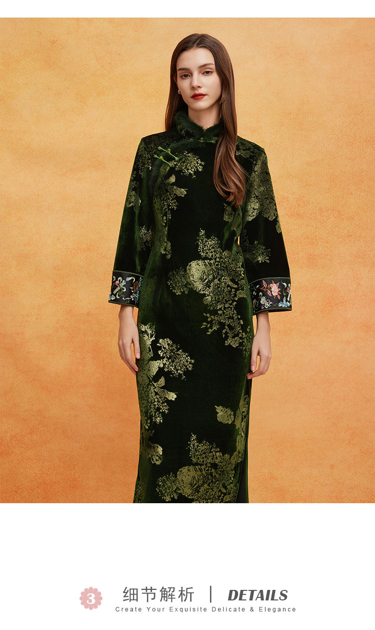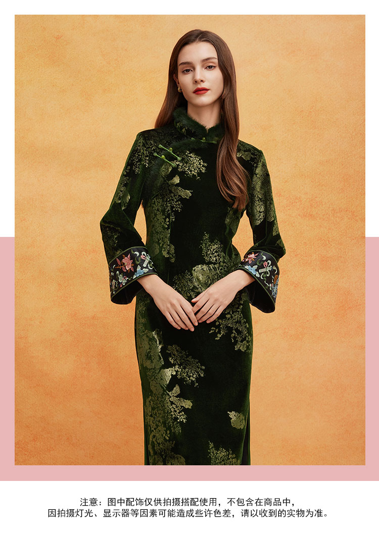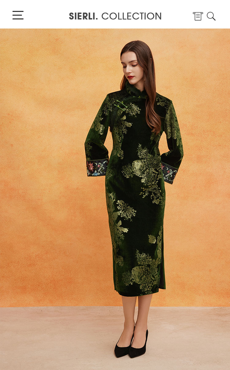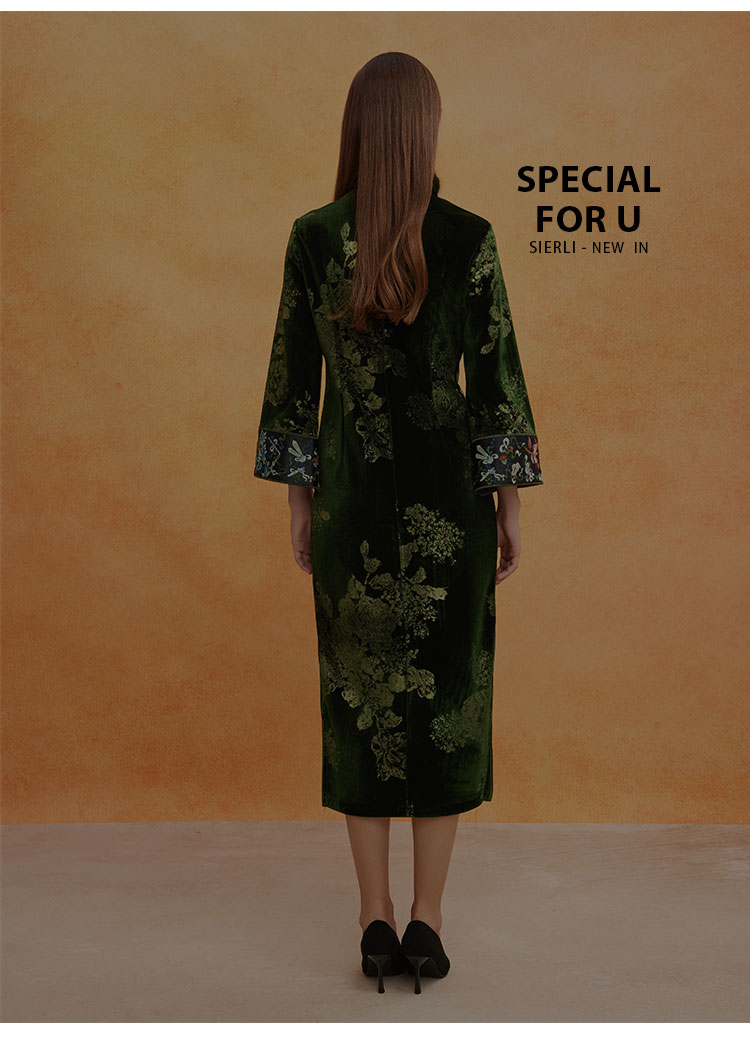 QE807斯尔丽25春季新中式喜庆百年战袍烫金印花袖口刺绣领口门襟旗袍