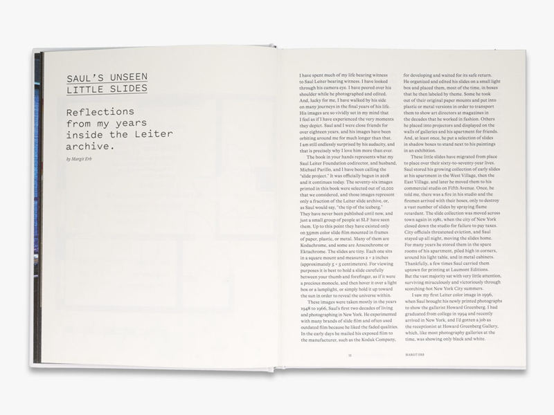 2013年去世时,他留下了4万多张彩色幻灯片,其中只有一小部分见过光。本书展示了从这个非凡的摄影宝库中新发掘出来的76张图片,并首次在此出版。本书由Saul Leiter基金会的Margit Erb和Michael Parillo精心策划,并辅以文字说明Leiter如何建立幻灯片档案,以及现在如何对其进行探索、编目和修复,这本专著将是全世界摄影爱好者别错过了~