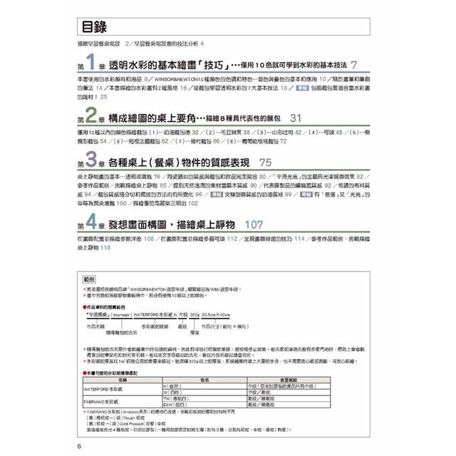 本書使用的水彩顏料和用品 8/WINSOR&NEWTON10種顏色的色調和特色…混色與疊色的基本和應用 10/關於畫筆和筆刷的筆法 14/本書描繪的水彩畫有2種風格 16/從麵包學習透明水彩的7大基本技法 18/ 專欄 包餡麵包適合當水彩畫的題材! 25