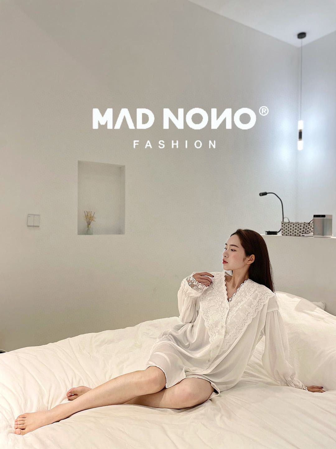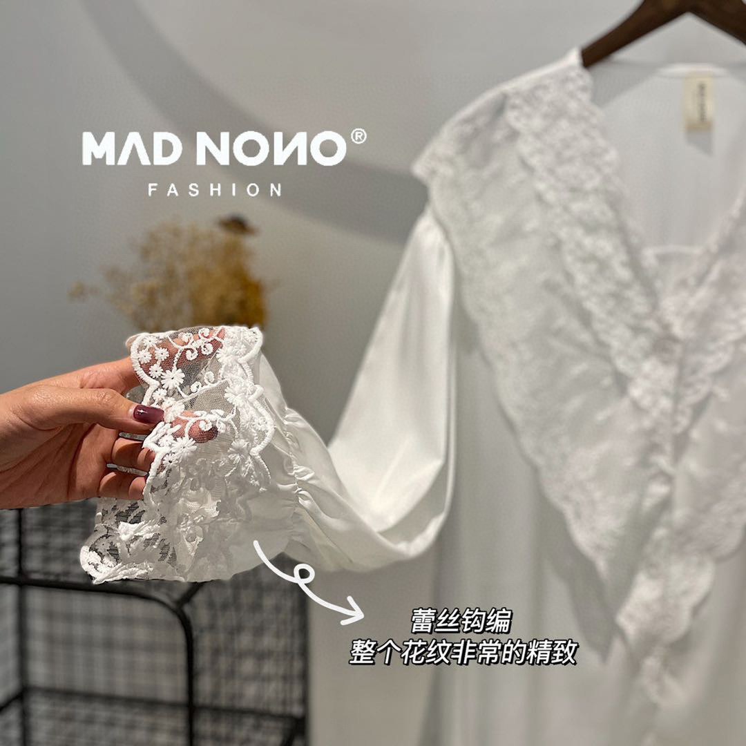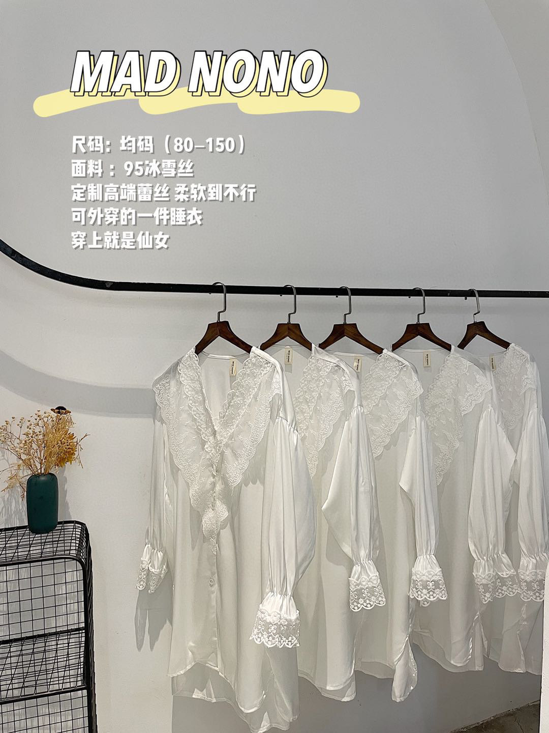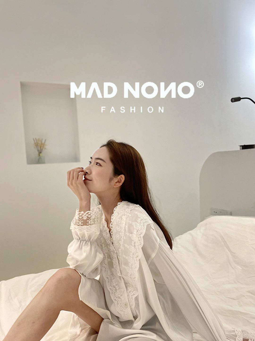 MAD NONO日系元气睡裙2023年夏季新款性感蕾丝薄白色长袖睡衣裙子