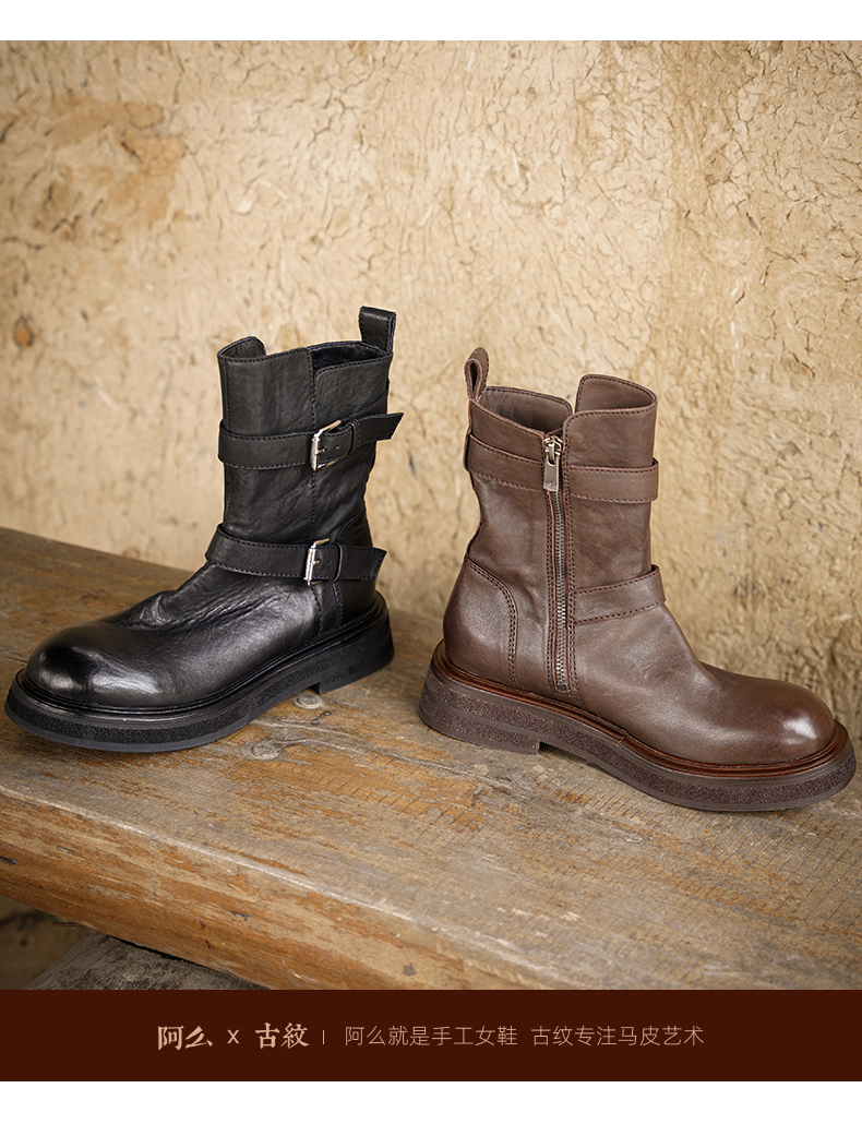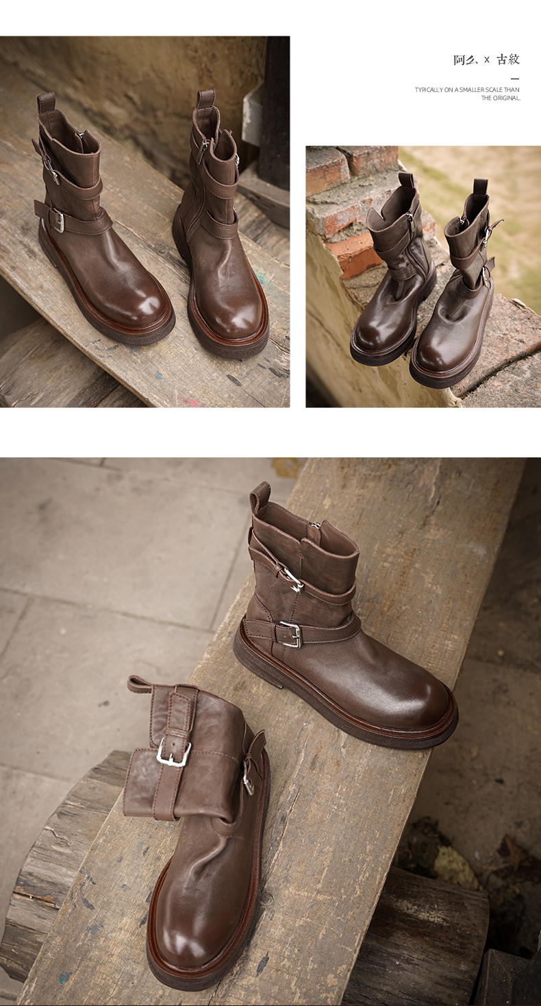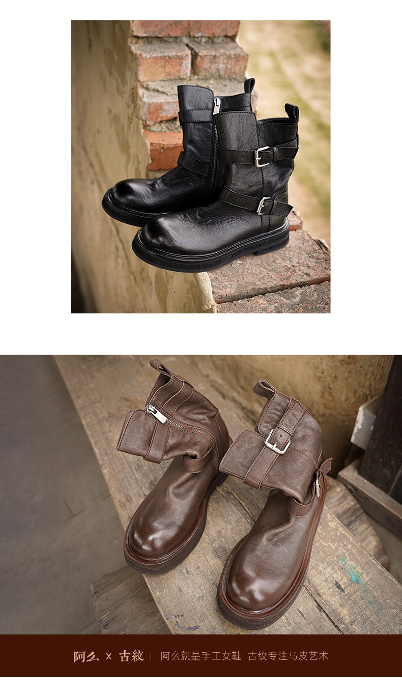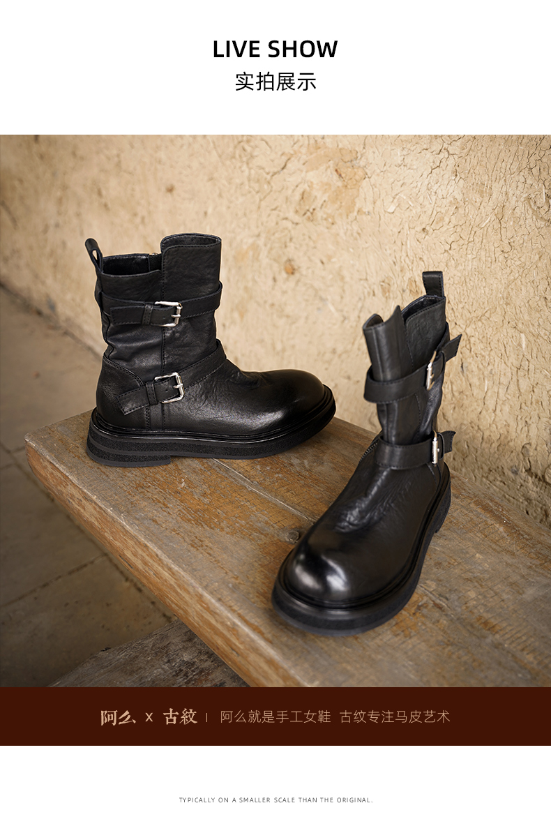 【阿么古纹马皮鞋】水洗复古皮带扣单靴2025新款短筒机车靴女3.5CM