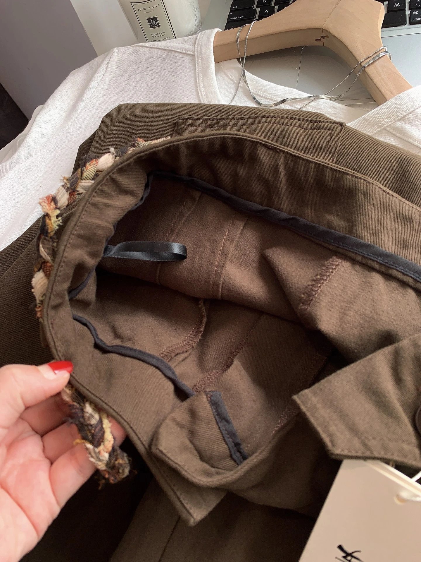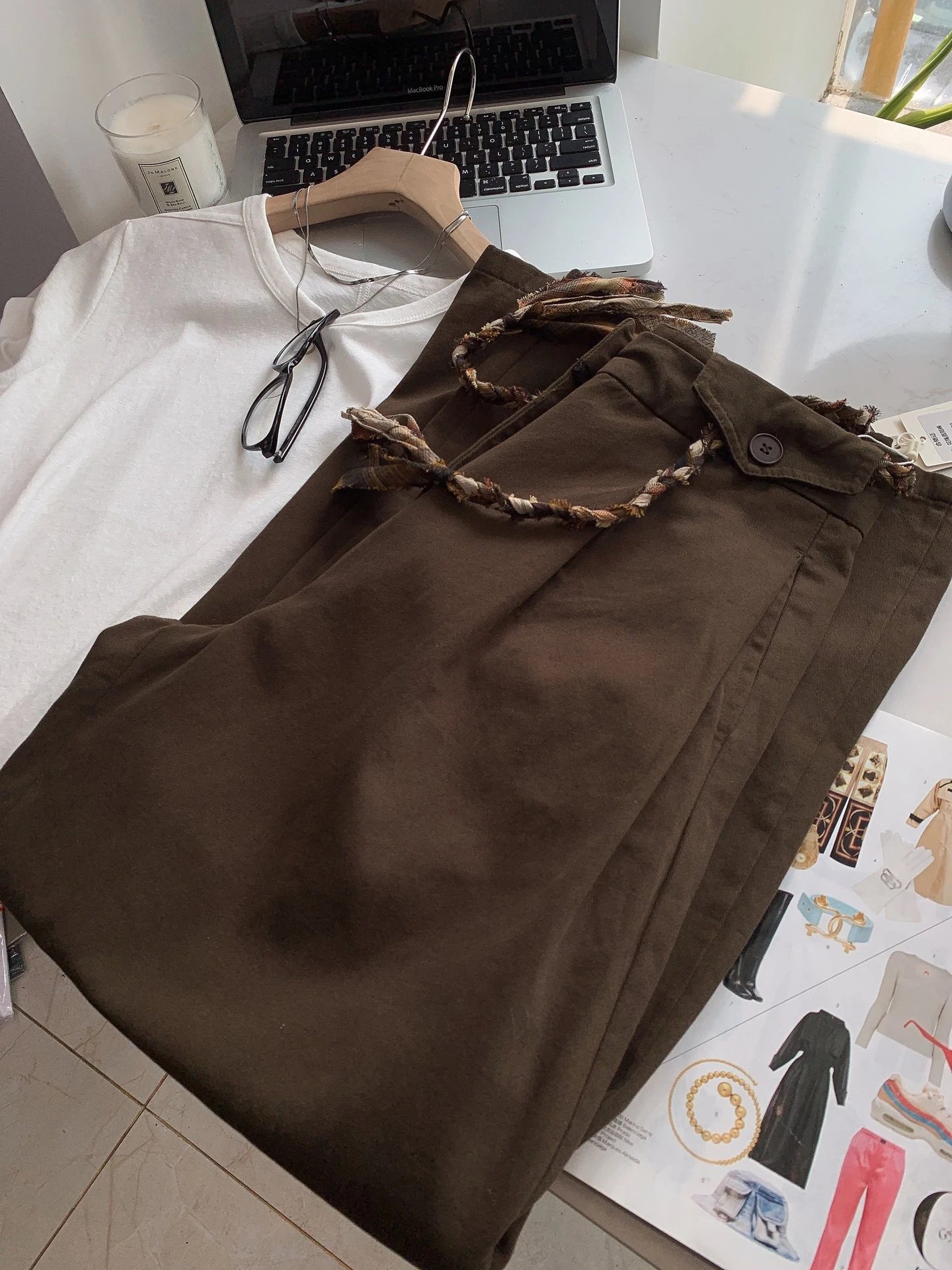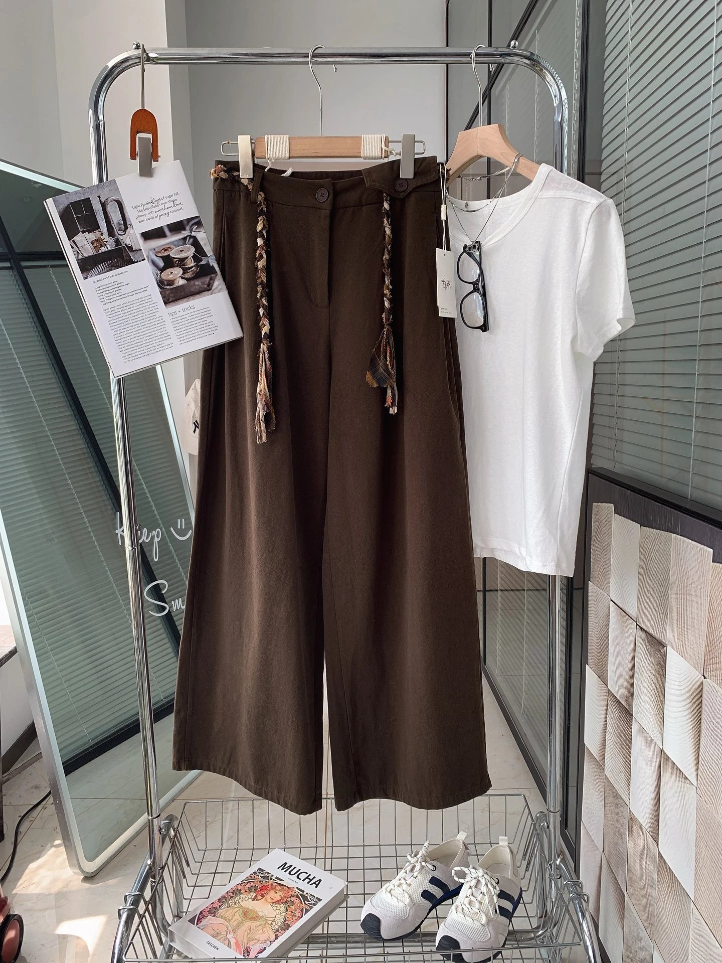 定制格纹编织绳腰头,毛边流苏设计,复古氛围感直接拉满,区别于普通阔腿裤,细节感满满,轻松穿出高级感