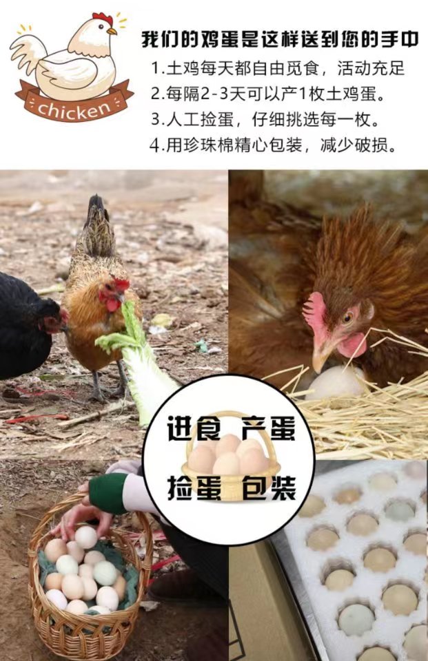 自家深山林散养的柴鸡,又叫土鸡,溜达鸡,无饲料无任何添加剂,吃的是山上的虫子,喂的是玉米,小米糠,各种菜,山上的果子,四季吃的不同,产出的蛋味道也不同。绝对农家喂养,回归自然。