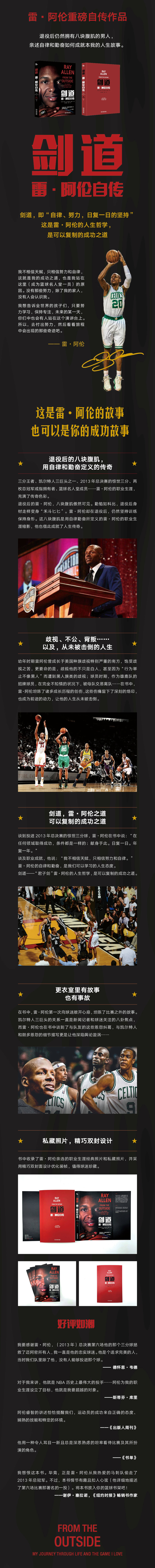 他职业生涯三分球命中2973个,睥睨古今,是NBA的三分之王;他纵横球场十八载,是手握两枚总冠军戒指的篮球名人堂明星;他球风儒雅,性格温和,翩翩有君子之风;他勤勉,自律,高效,僵持时分,他能挺身而出,关键时刻,他可一剑封喉。他就是“君子剑”雷-阿伦。退役两年后,篮球雷·阿伦出版了自传《剑道》。在这本回忆录中,雷·阿伦畅谈了他的生活观、球场上的友情与竞争、他效力过的伟大球队以及要想拥有长久且成功的职业生涯需要具备什么素质。