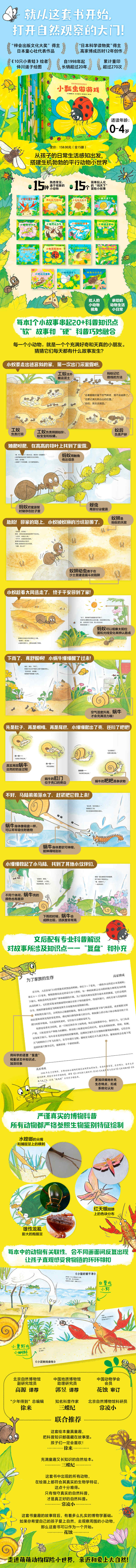 这是一套面向2-5岁宝宝的科普故事启蒙绘本,共包含15本:《独角仙大力士》《小瓢虫做游戏》《小蝴蝶要学飞》《小蜗牛爱下雨》《小蚂蚁采蜜露》《小蜻蜓忙避暑》《小螯虾爱干净》《小泥鳅找食物》《小锹甲比力气》《小乌龟去散步》《西瓜虫巧脱险》《小螳螂快长大》《小蚂蚱蹦蹦跳》《小青鳉朋友多》《小雨蛙去冒险》。它以15种小朋友喜爱又熟悉的小动物为主角,以简单有趣的文字展开它们每天的生活冒险小故事。图画故事与科普知识巧妙融合,书中每一页都至少有一个知识点。故事完成后,文后还有一篇科普小文章,对故事中涉及的知识点一一“复盘”,从更专业和全面的角度,严谨准确地讲解它们的生态习性,帮助孩子形成一个系统性的认知,引导孩子细致观察,亲近自然。