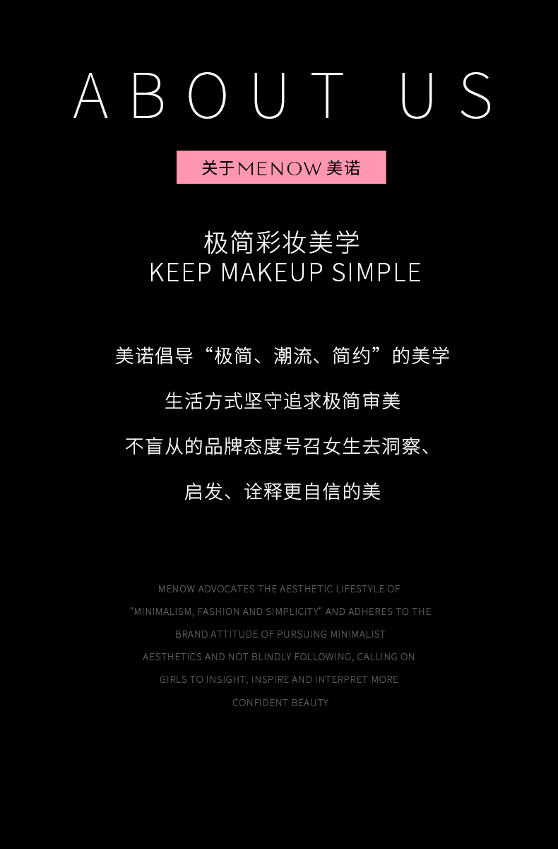 - 全球性彩妆品牌,专注开发高品质的适用性美妆产品。拥有20多年美妆经验,产品远销欧美等80多个国家。美诺彩妆致力于给用户带来“爱与美,年轻,不一样的品质彩妆体验”。