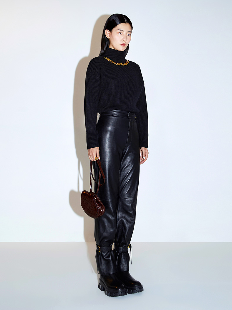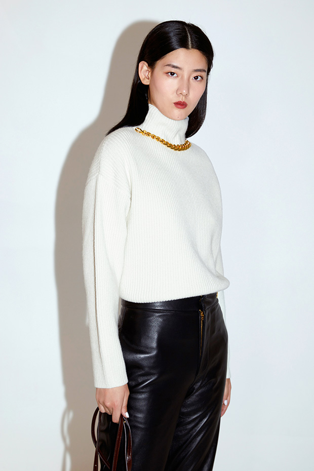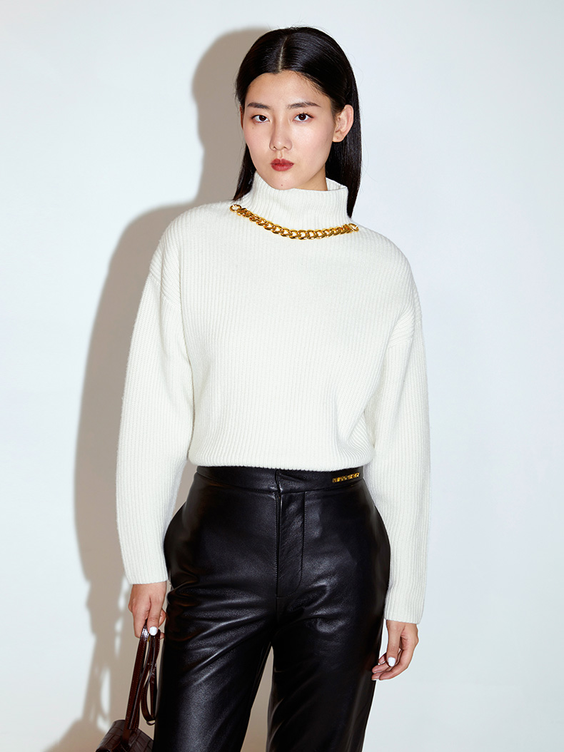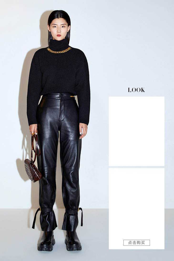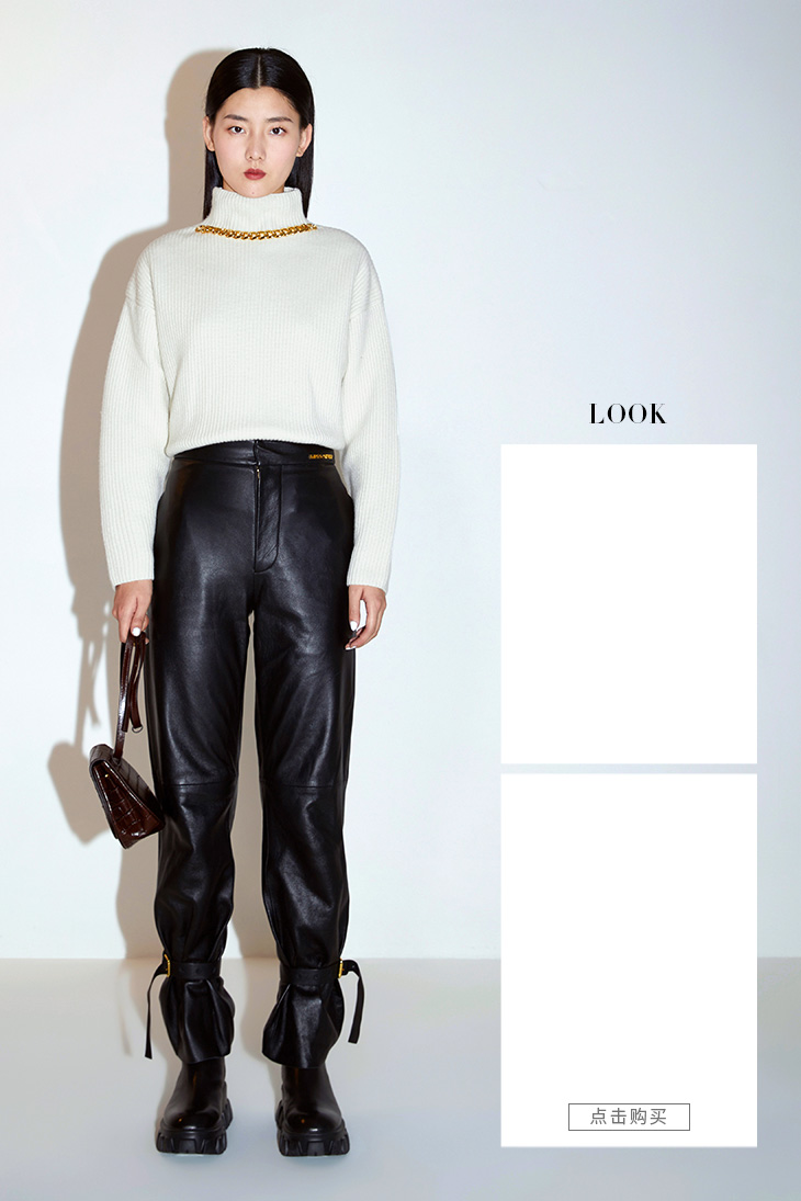 雅致高领缀以金属“项链”,提升设计亮点,吸睛个性