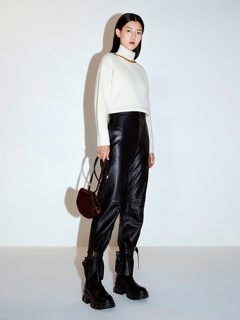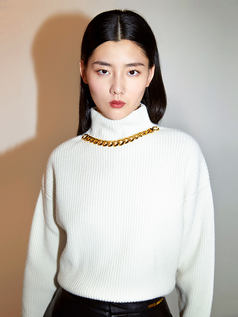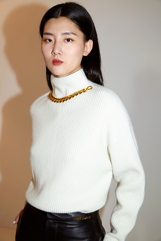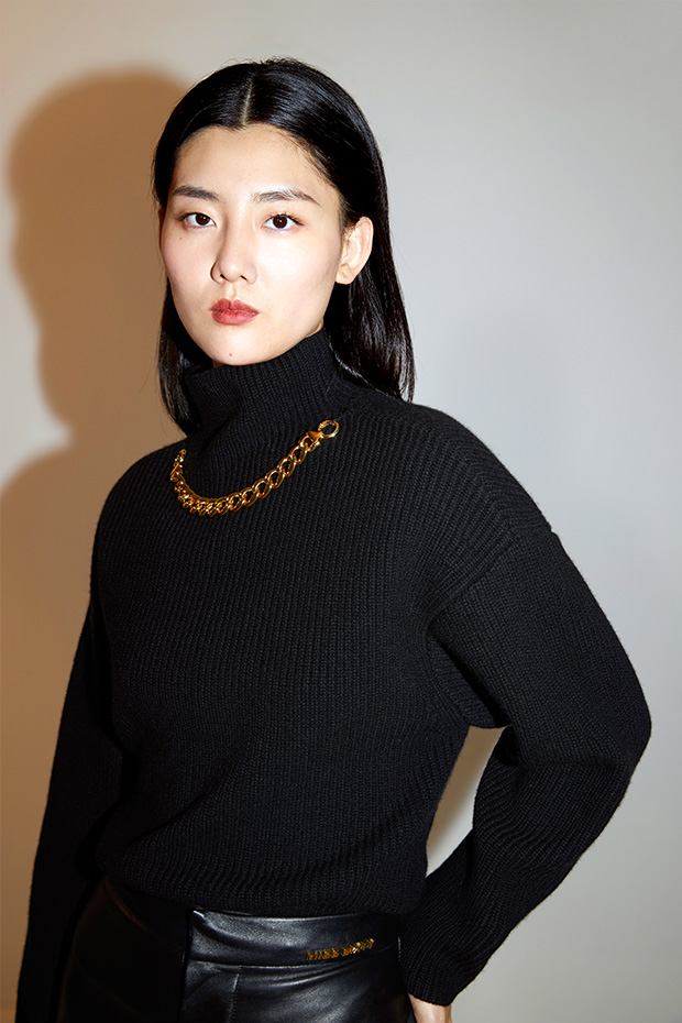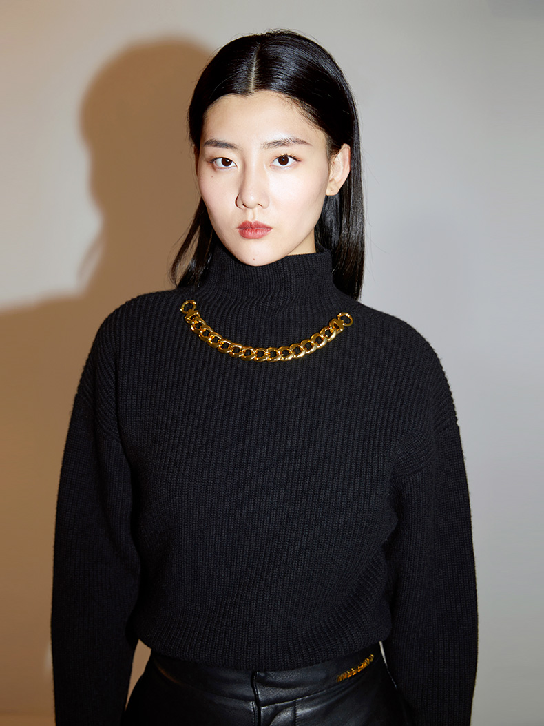 雅致高领缀以金属“项链”,提升设计亮点,吸睛个性