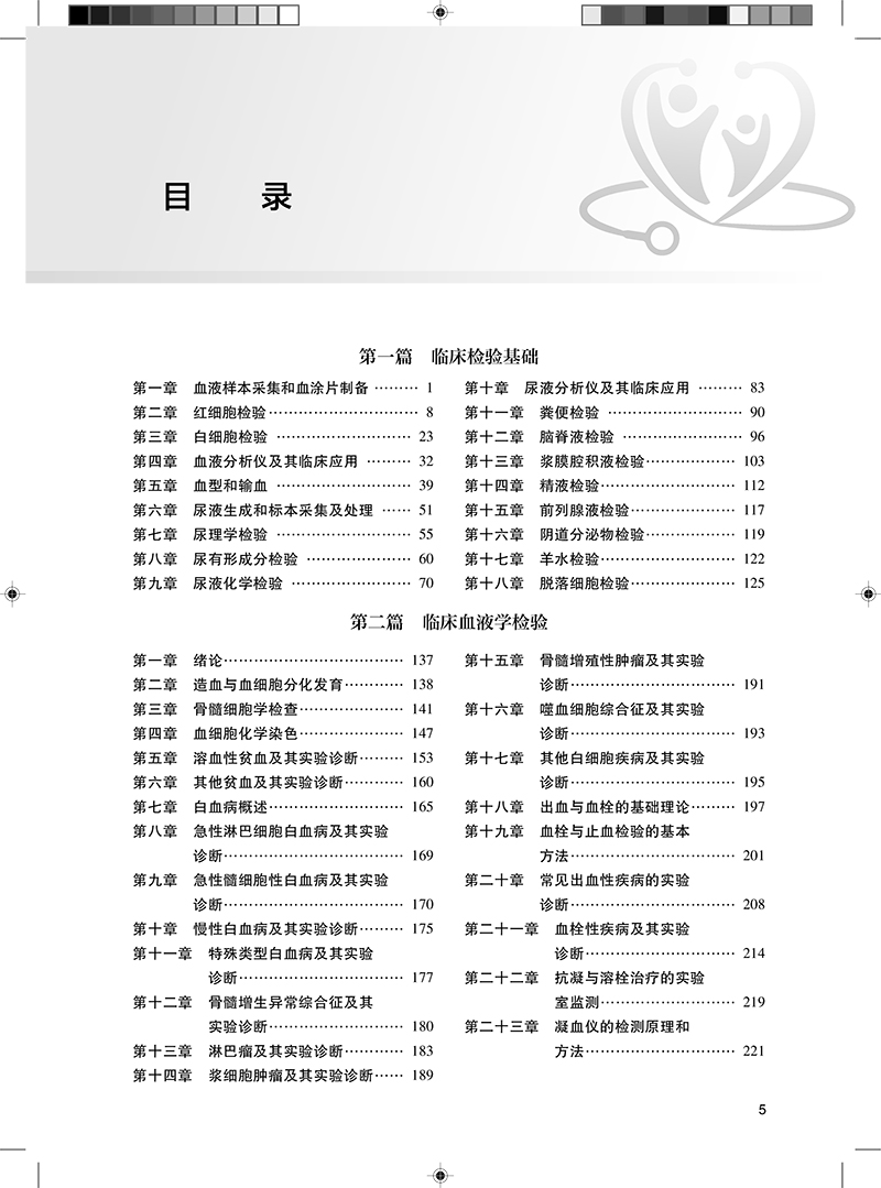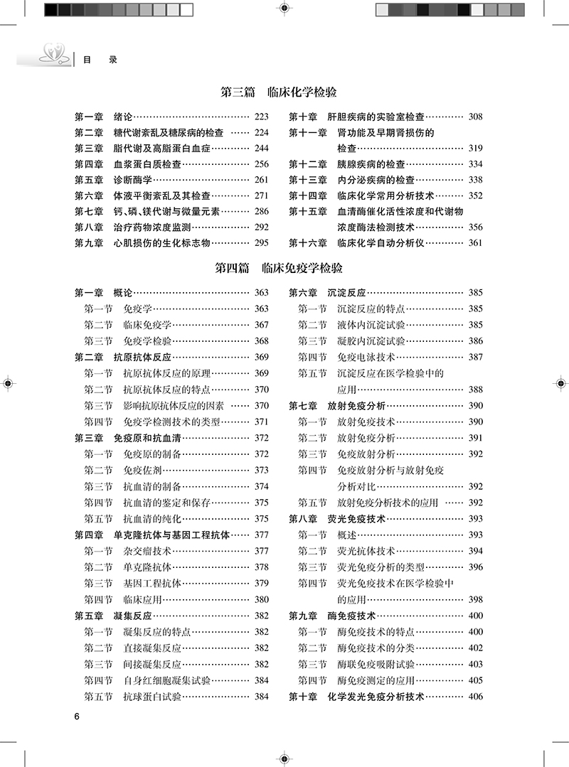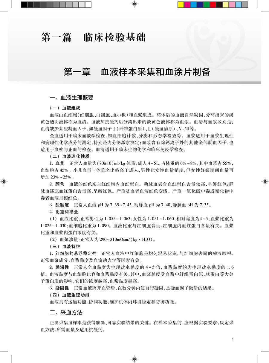 第一篇 第一章血液样本采集和血涂片制备 第二章红细胞检验 第十一章粪便检验 第十二章脑脊液检验 第十三章浆膜腔积液检验 第十四章精液检验 第十五章前列腺液检验 第十六章阴道分泌物检验 第十七章羊水检验 第十八章脱落细胞检验 第二章 第一章绪论 第二章造血与血细胞分化发育 第三章骨髓细胞学检查 第四章血细胞化学染色 第五章溶血性贫血及其实验诊断 第六章其他贫血及其实验诊断 第七章白血病概述 第八章急性淋巴细胞白血病及其实验诊断 第九章急性髓细胞性白血病及其实验诊断 第十章慢性白血病及其实验诊断 第十一章特殊类型白血病及其实验诊断 第十二章骨髓增生异常综合征及其实验诊断 第十三章淋巴瘤及其实验诊断 第十四章浆细胞肿瘤及其实验诊断 第十五章骨髓增殖性肿瘤及其实验诊断 第十六章噬血细胞综合征及其实验诊断 第十七章其他白细胞疾病及其实验诊断 第十八章出血与血栓的基础理论 第十九章血栓与止血检验的基本方法 第二十章常见出血性疾病的实验诊断 第二十一章血栓性疾病及其实验诊断 第二十二章抗凝与溶栓治疗的实验室监测 第二十三章凝血仪的检测原理和方法 第三章 第一章绪论 第二章糖代谢紊乱及糖尿病的检查 第三章脂代谢及高脂蛋白血症 第四章血浆蛋白质检查 第五章诊断酶学 第六章体液平衡紊乱及其检查 第七章钙、磷、镁代谢与微量元素 第八章治疗药物浓度监测 第九章心肌损伤的生化标志物 第十章肝胆疾病的实验室检查 第十一章肾功能及早期肾损伤的检查 第十二章胰腺疾病的检查 第十三章内分泌疾病的检查 第十四章临床化学常用分析技术 第十五章血清酶催化活性浓度和代谢物浓度酶法检测技术 第十六章临床化学自动分析仪 第四章 第一章概论 第一节免疫学 第二节临床免疫学 第三节免疫学检验 第二章抗原抗体反应 第一节抗原抗体反应的原理 第二节抗原抗体反应的特点 第三节影响抗原抗体反应的因素 第四节免疫学检测技术的类型 第三章免疫原和抗血清 第一节免疫原的制备 第二节免疫佐剂 第三节抗血清的制备 第四节抗血清的鉴定和保存 第五节抗血清的纯化 第四章单克隆抗体与基因工程抗体 第一节杂交瘤技术 第二节单克隆抗体 第三节基因工程抗体 第四节临床应用 第五章凝集反应 第一节凝集反应的特点 第二节直接凝集反应 第三节间接凝集反应 第四节自身红细胞凝集试验 第五节抗球蛋白试验 第六章沉淀反应 第一节沉淀反应的特点 第二节液体内沉淀试验 第三节凝胶内沉淀试验 第四节免疫电泳技术 第五节沉淀反应在医学检验中的应用 第七章放射免疫分析 第一节放射免疫技术 第二节放射免疫分析 第三节免疫放射分析 第四节免疫放射分析与放射免疫分析对比 第五节放射免疫分析技术的应用 第八章荧光免疫技术 第一节概述 第二节荧光抗体技术 第三节荧光免疫分析的类型 第四节荧光免疫技术在医学检验中的应用 第九章酶免疫技术 第一节酶免疫技术的特点 第二节酶免疫技术的分类 第三节酶联免疫吸附试验 第四节酶免疫测定的应用 第十章化学发光免疫分析技术 第五章临床微生物学检验 第一节概述 第二节化学发光剂和标记技术 第三节化学发光免疫分析的类型 第十一章!生物素"亲和素放大技术 第一节生物素的理化性质与标记 第二节亲和素、链霉亲和素的理化性质与标记 第三节生物素生亲和素系统的特点 第四节生物素生亲和素系统的应用 第十二章固相膜免疫测定 第一节概述 第二节免疫金标记技术 第三节膜载体免疫测定的种类与原理 第十三章免疫组织化学技术 第一节概述 第二节免疫荧光组织化学技术 第三节酶免疫组织化学技术 第四节亲和组织化学染色 第五节免疫标记电镜技术 第六节免疫组织化学技术的应用 第十四章免疫细胞的分离及其表面标志检测技术 第一节免疫细胞的分离 第二节淋巴细胞的表面标志及亚群分类 第三节其他免疫细胞的表面标志 第四节免疫细胞表面标志的检测及应用 第十五章免疫细胞功能检测技术 第一节淋巴细胞的功能检测 第二节吞噬细胞的功能检测 第三节免疫细胞功能检测的临床应用 第十六章细胞因子与细胞黏附分子的测定 第一节生物学测定方法 第二节免疫测定方法 第三节细胞因子与细胞黏附分子测定的临床应用 第十七章流式细胞仪分析技术及应用 第一节概述 第二节数据的显示与分析 第三节流式细胞仪免疫分析的技术要求 第四节流式细胞术在免疫学检查中的应用 第十八章体液免疫球蛋白测定 第一节血清-./、-.、、-.1 第二节血清 第三节尿液及脑脊液-. 第四节血清 第五节1蛋白 第六节轻链 第七节冷球蛋白 第十九章补体检测及应用 第一节概述 第二节补体总活性测定 第三节单个补体成分的测定 第四节补体结合试验 第五节补体受体的测定 第六节补体测定的应用 第二十章免疫检验自动化仪器分析 第一节自动化免疫浊度分析系统 第二节自动化发光免疫分析系统 第三节自动化荧光免疫分析系统 第四节自动化酶联免疫分析系统 第二十一章临床免疫检验的质量保证 第一节概述 第二节免疫检验的质量控制原则 第三节质量保证、室内质控和室间质评之间的关系 第四节免疫检验的常用质量控制 第五节免疫检验室内质量控制的数据处理 第二十二章感染性疾病与感染