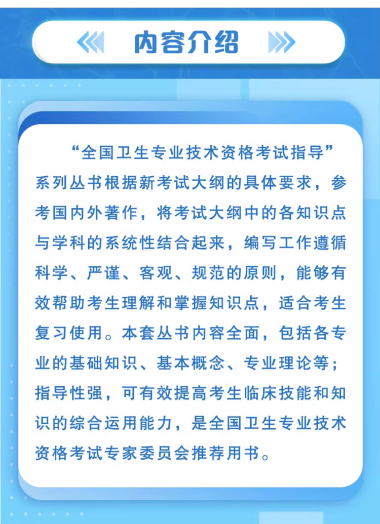 “全国卫生专业技术资格考试指导”系列丛书根据最新考试大纲的具体要求,参考国内外权威著作,将考试大纲中的各知识点与学科的系统性结合起来,编写工作遵循科学、严谨、客观、规范的原则,能够有效帮助考生理解和掌握知识点,适合考生复习使用。本套丛书内容全面,包括各专业的基础知识、基本概念、专业理论等;指导性强,可有效提高考生临床技能和知识的综合运用能力;权威性高,是全国卫生专业技术资格考试专家委员会推荐用书。