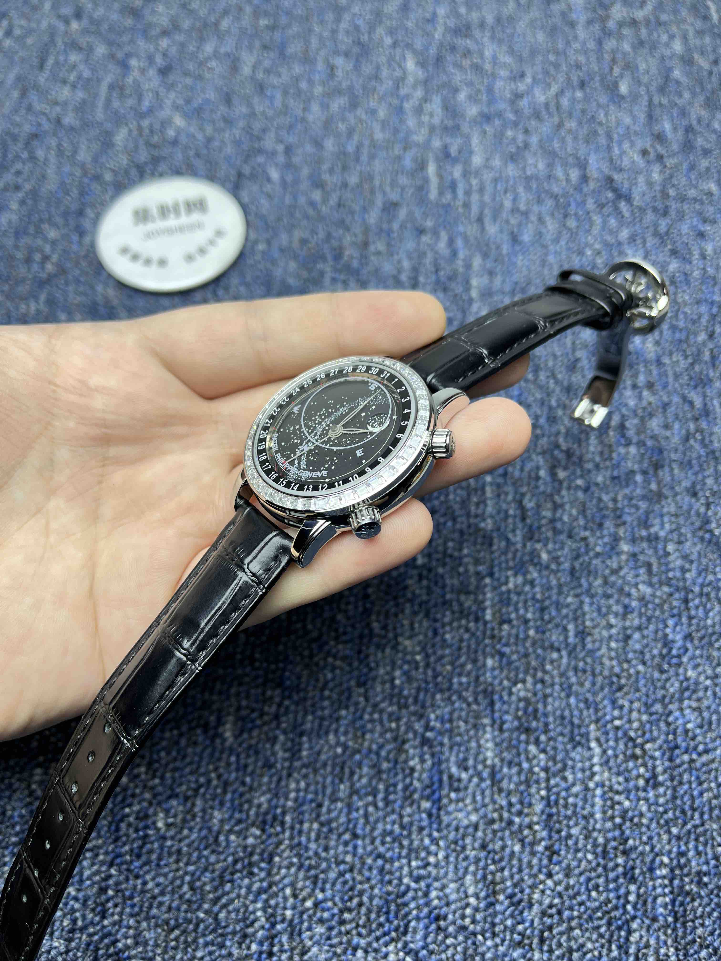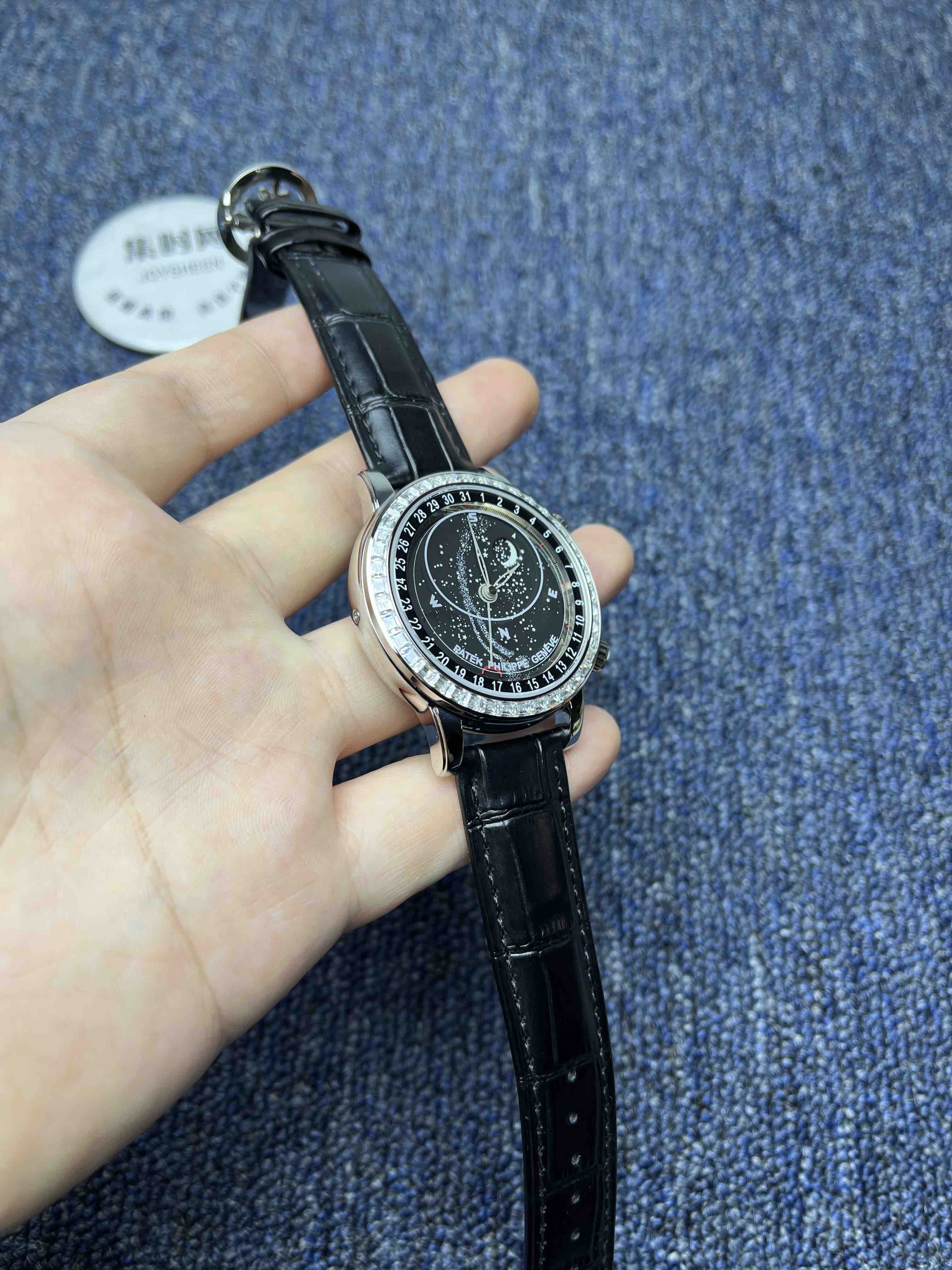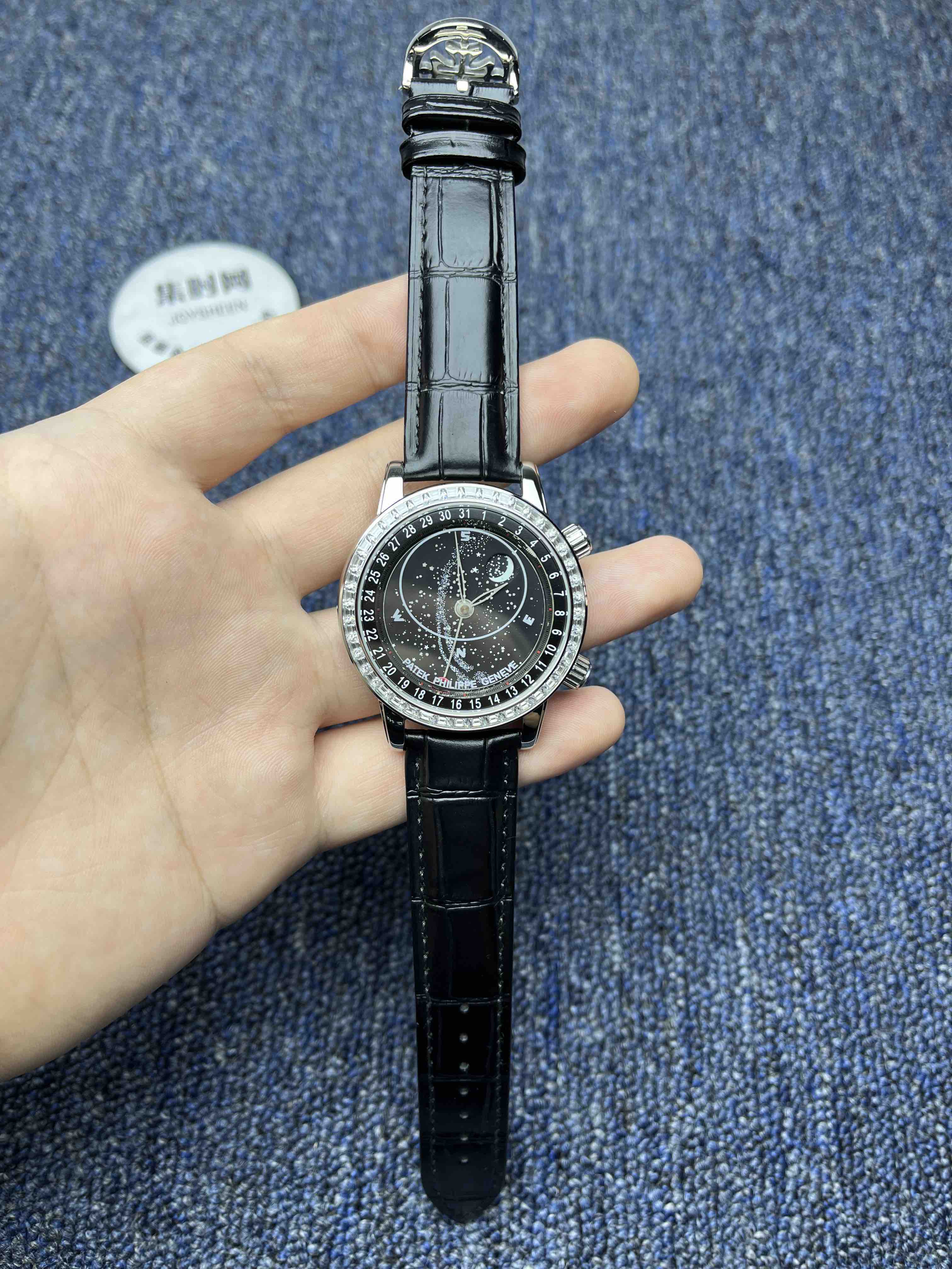 PP百达翡丽星空6104天月款日内瓦苍穹系列 男士腕表 你可想象把星空佩戴在腕上吗?这款星空腕表独具特别星象功能,蓝色圆表盘上就能欣赏日内瓦苍穹图,还有金色月球运行轨迹,熬时20个月 采用进口9015全自动机械机芯改造而成的珍珠陀,表盘上的月亮会根据天空的月亮月满圆 月蚀弯的情况自动变化 表壳前后玻璃采用先进技术处理让玻璃折射光提高,让表盘看起来更加通透 似乎没有玻璃的感觉 5字位把头调星空盘转动。本厂壳身百达花纹 花重金采CNC深雕刻 立体感凹凸感 超强。升级了24小时自转的星空 表盘尺寸43mm