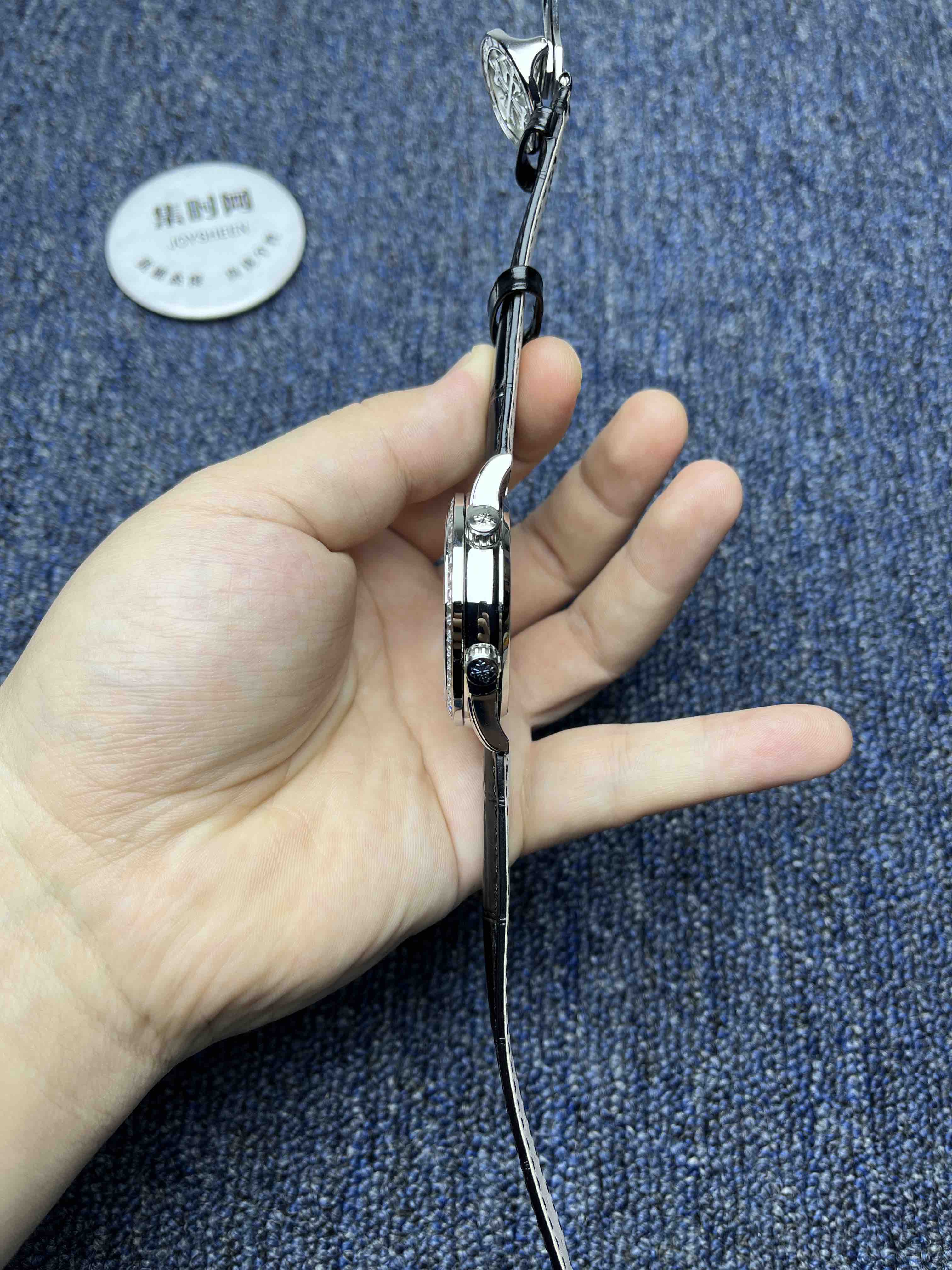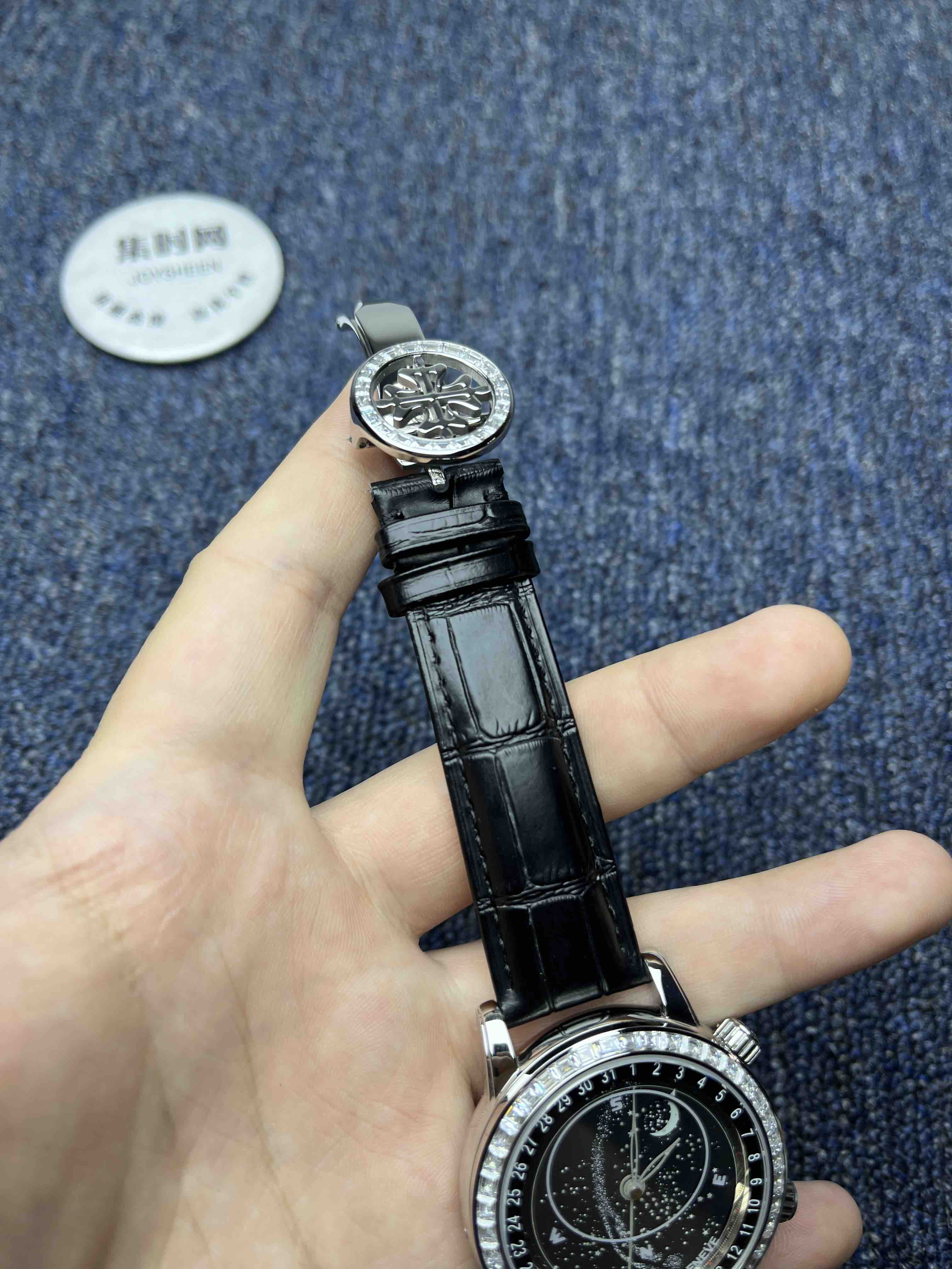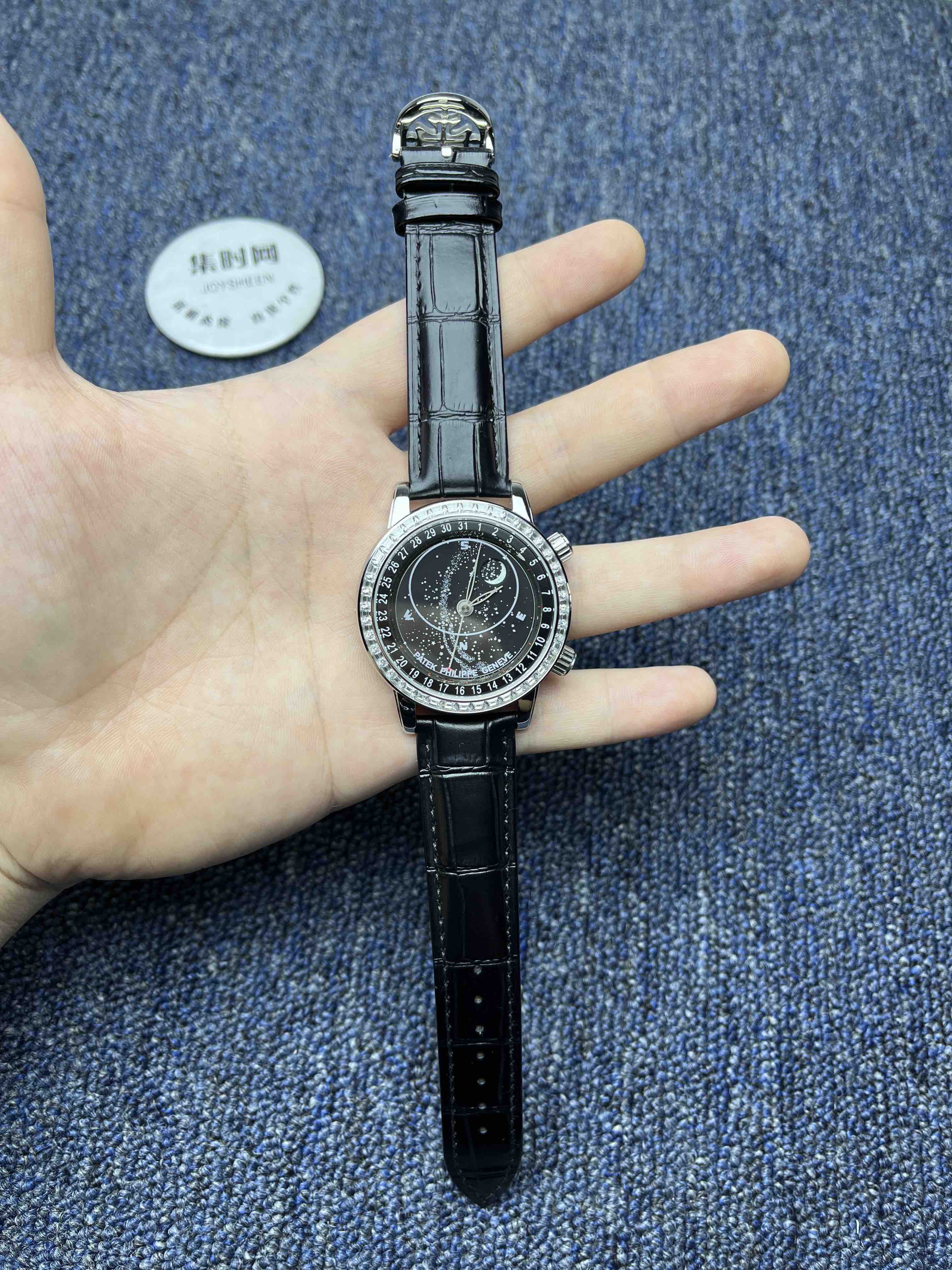 PP百达翡丽星空6104天月款日内瓦苍穹系列 男士腕表 你可想象把星空佩戴在腕上吗?这款星空腕表独具特别星象功能,蓝色圆表盘上就能欣赏日内瓦苍穹图,还有金色月球运行轨迹,熬时20个月 采用进口9015全自动机械机芯改造而成的珍珠陀,表盘上的月亮会根据天空的月亮月满圆 月蚀弯的情况自动变化 表壳前后玻璃采用先进技术处理让玻璃折射光提高,让表盘看起来更加通透 似乎没有玻璃的感觉 5字位把头调星空盘转动。本厂壳身百达花纹 花重金采CNC深雕刻 立体感凹凸感 超强。升级了24小时自转的星空 表盘尺寸43mm