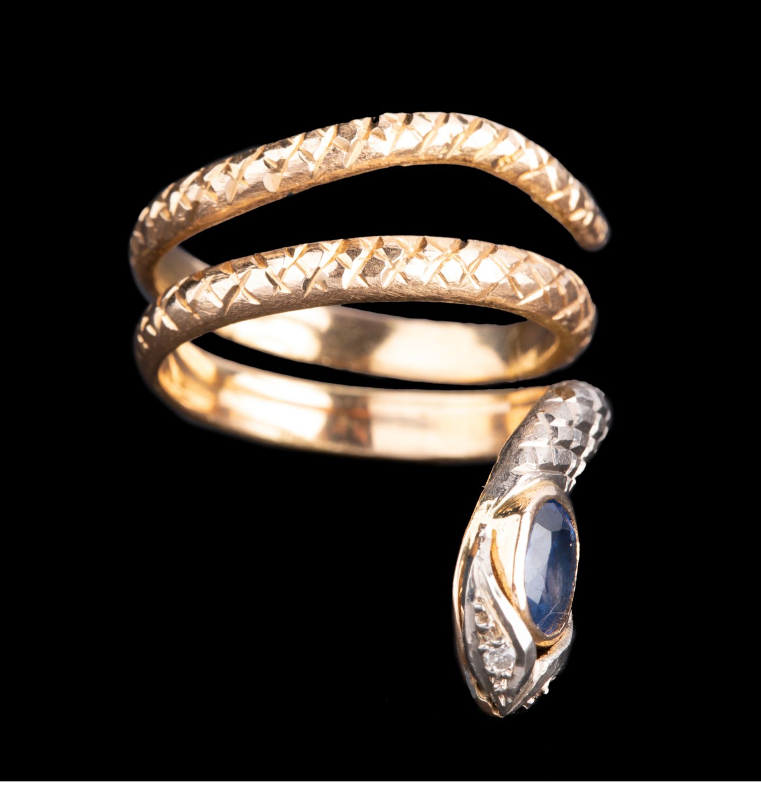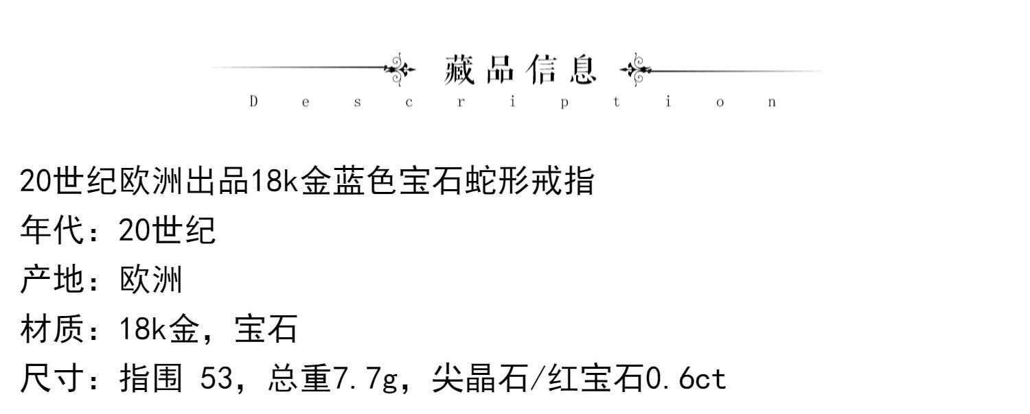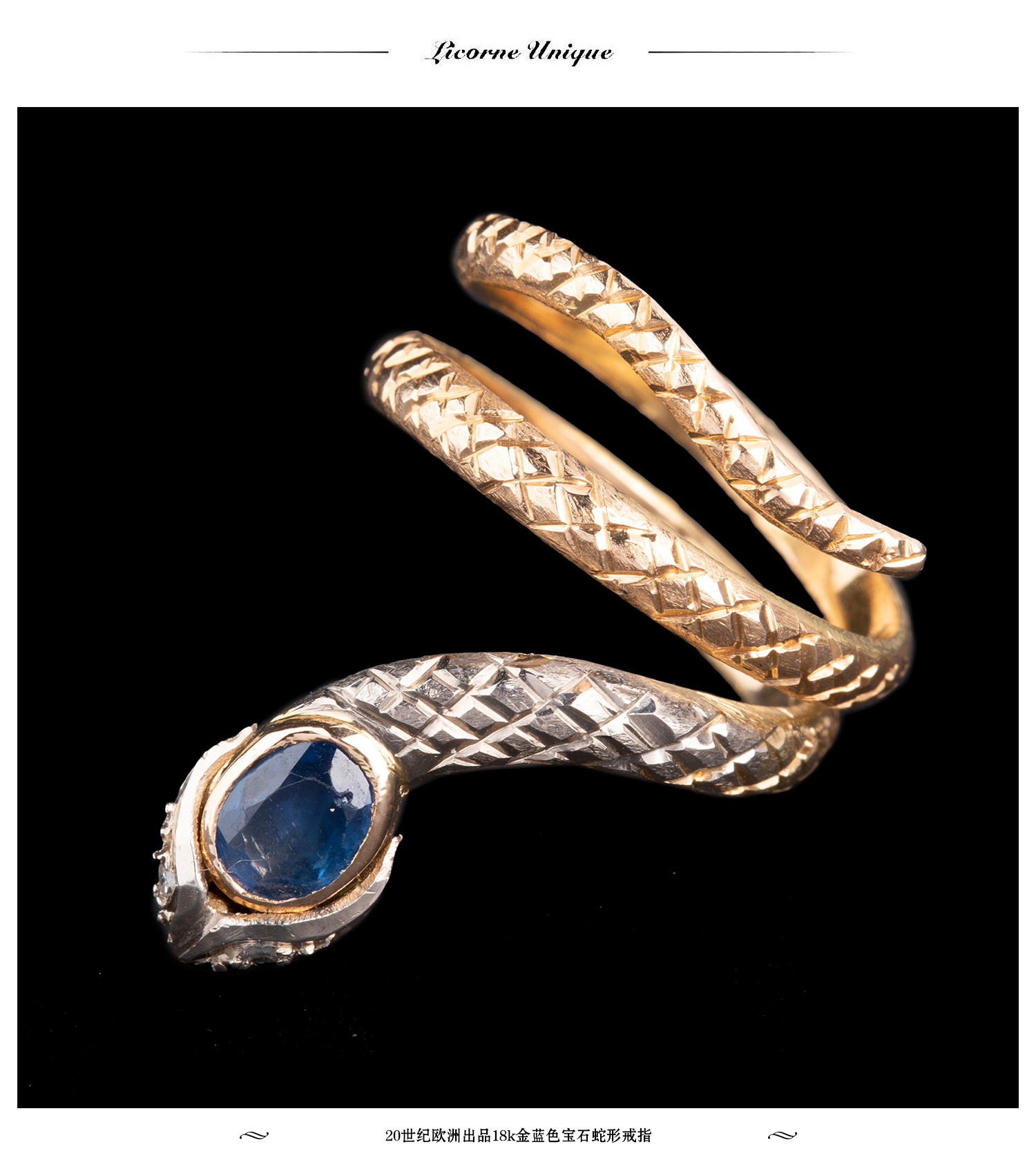 独角鹿西洋古董珠宝首饰20世纪欧洲出品18k金蓝色宝石蛇形戒指