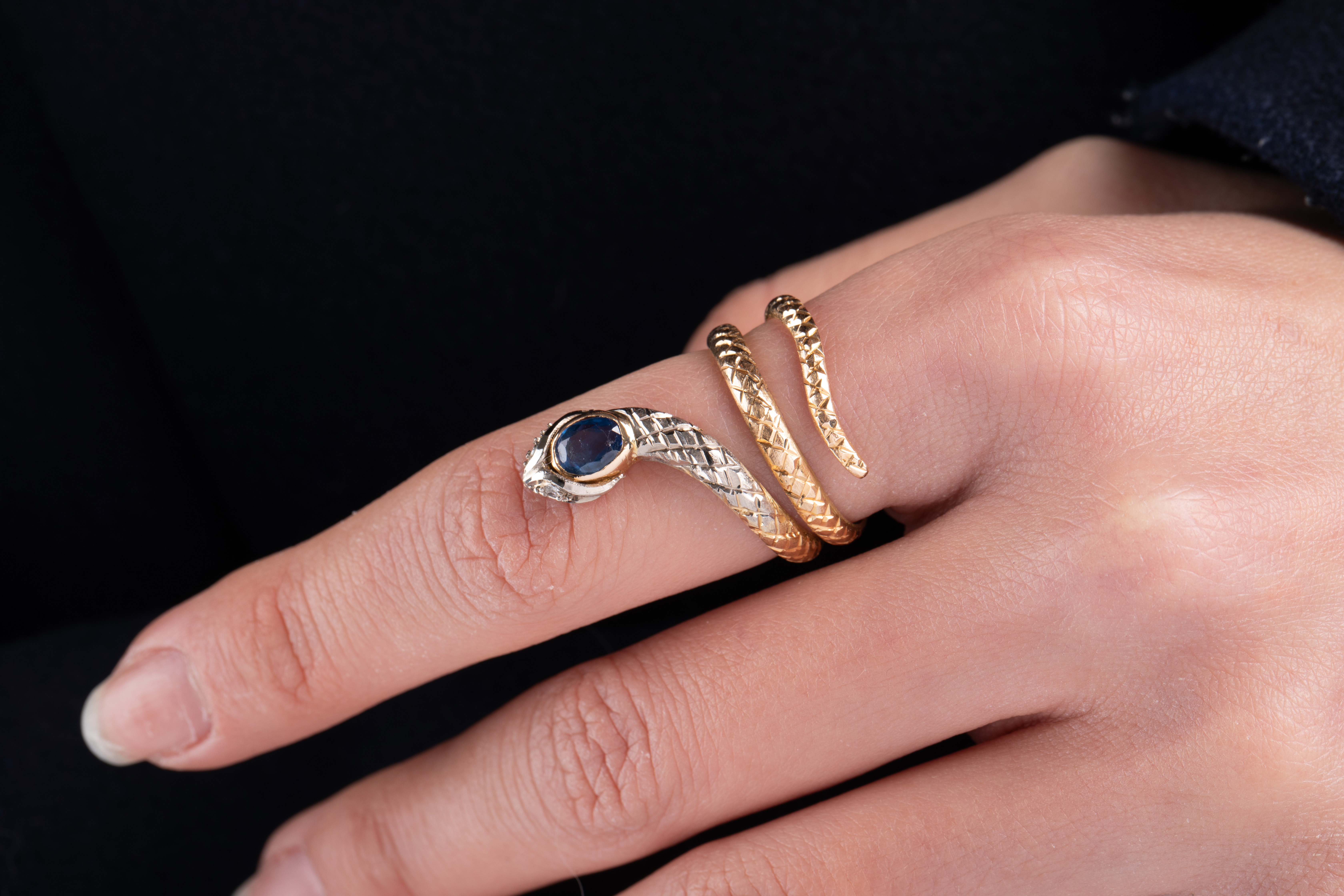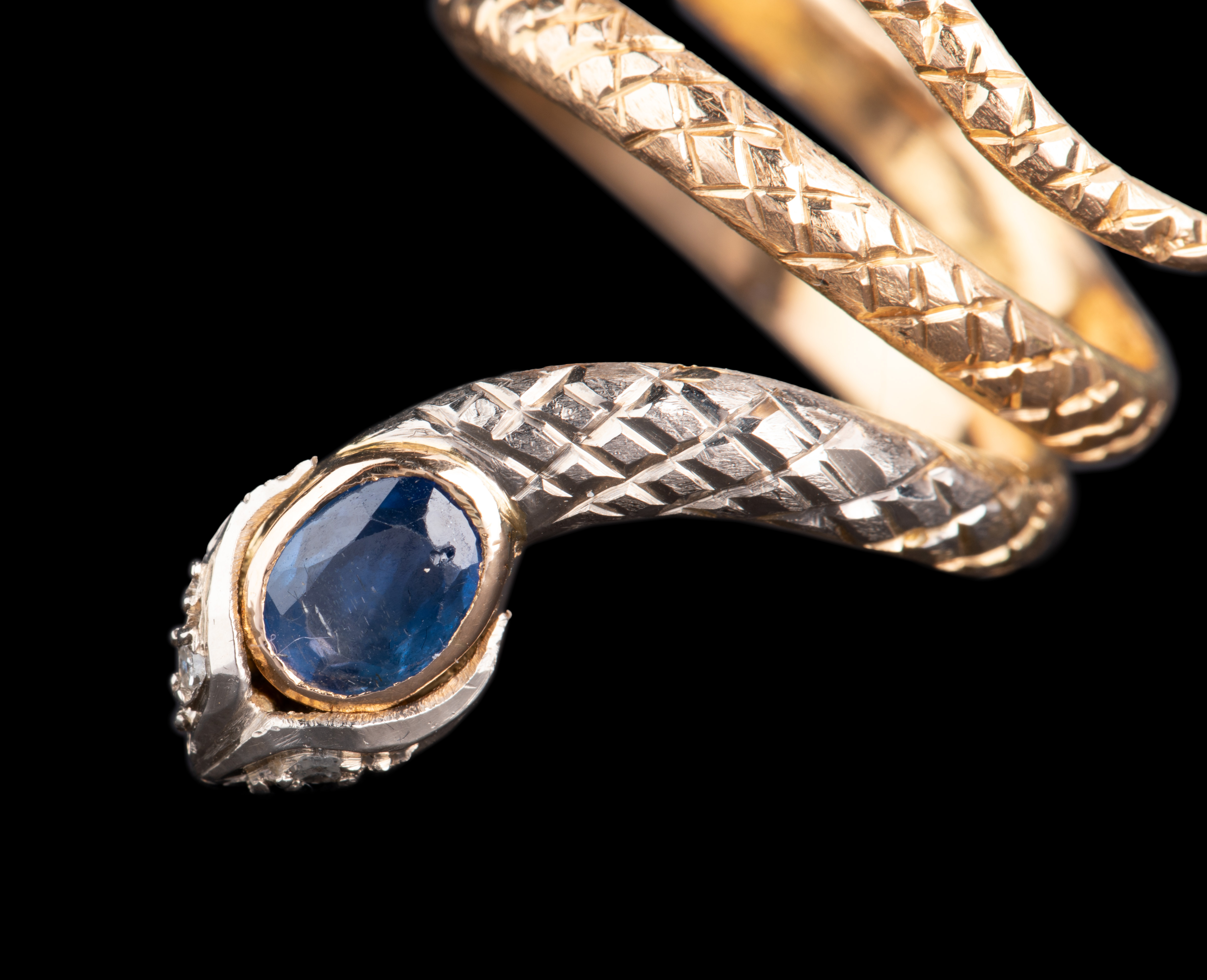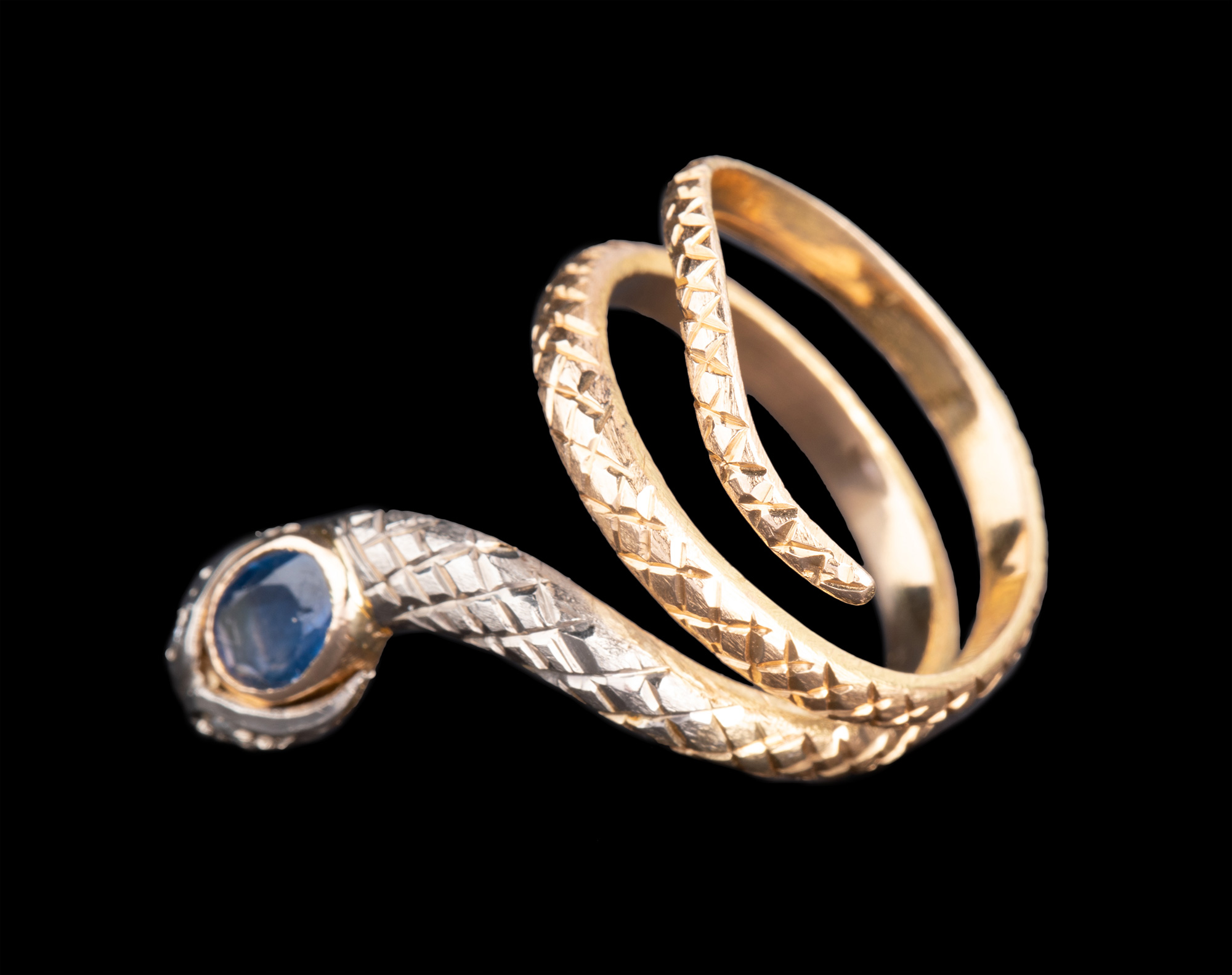 独角鹿西洋古董珠宝首饰20世纪欧洲出品18k金蓝色宝石蛇形戒指