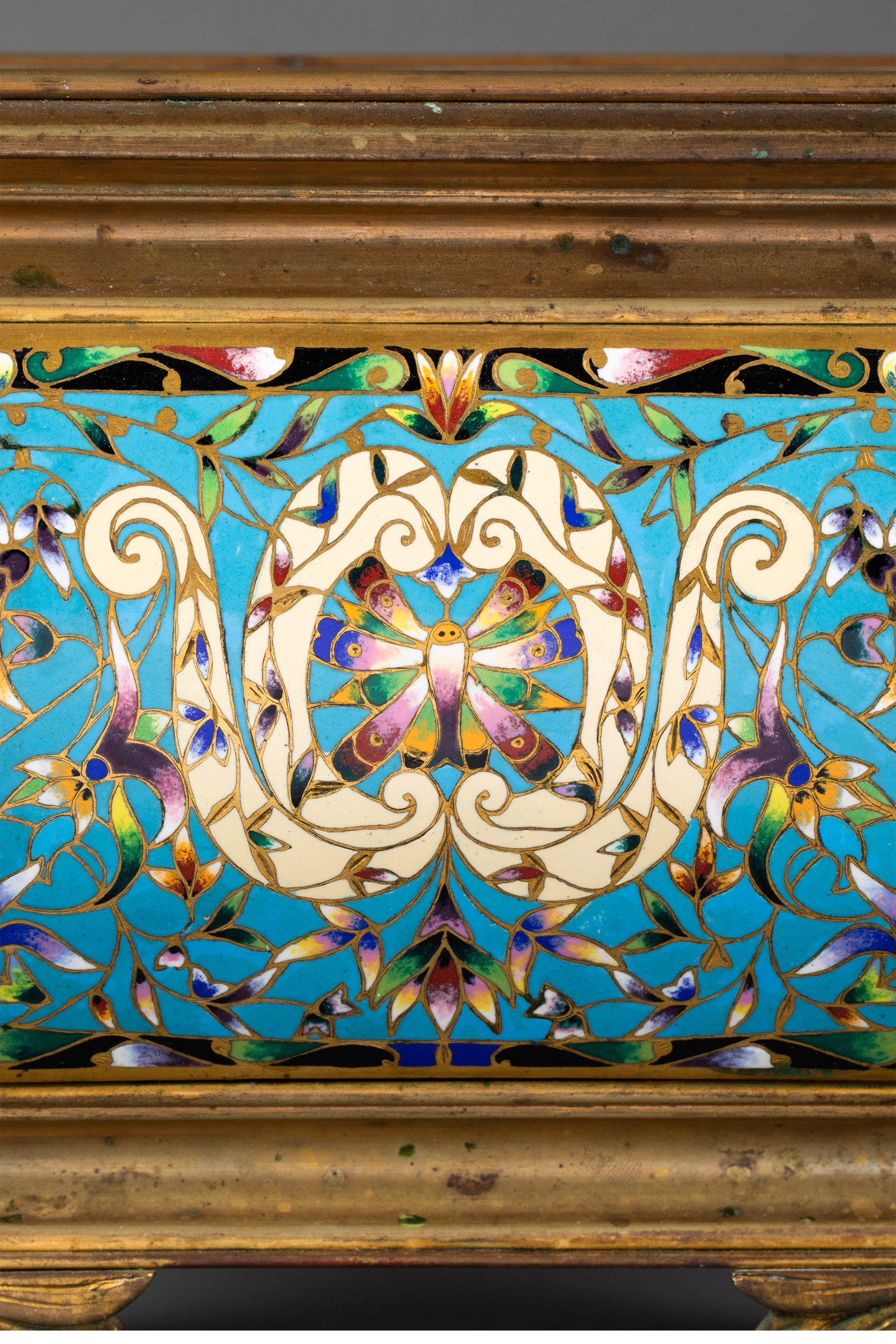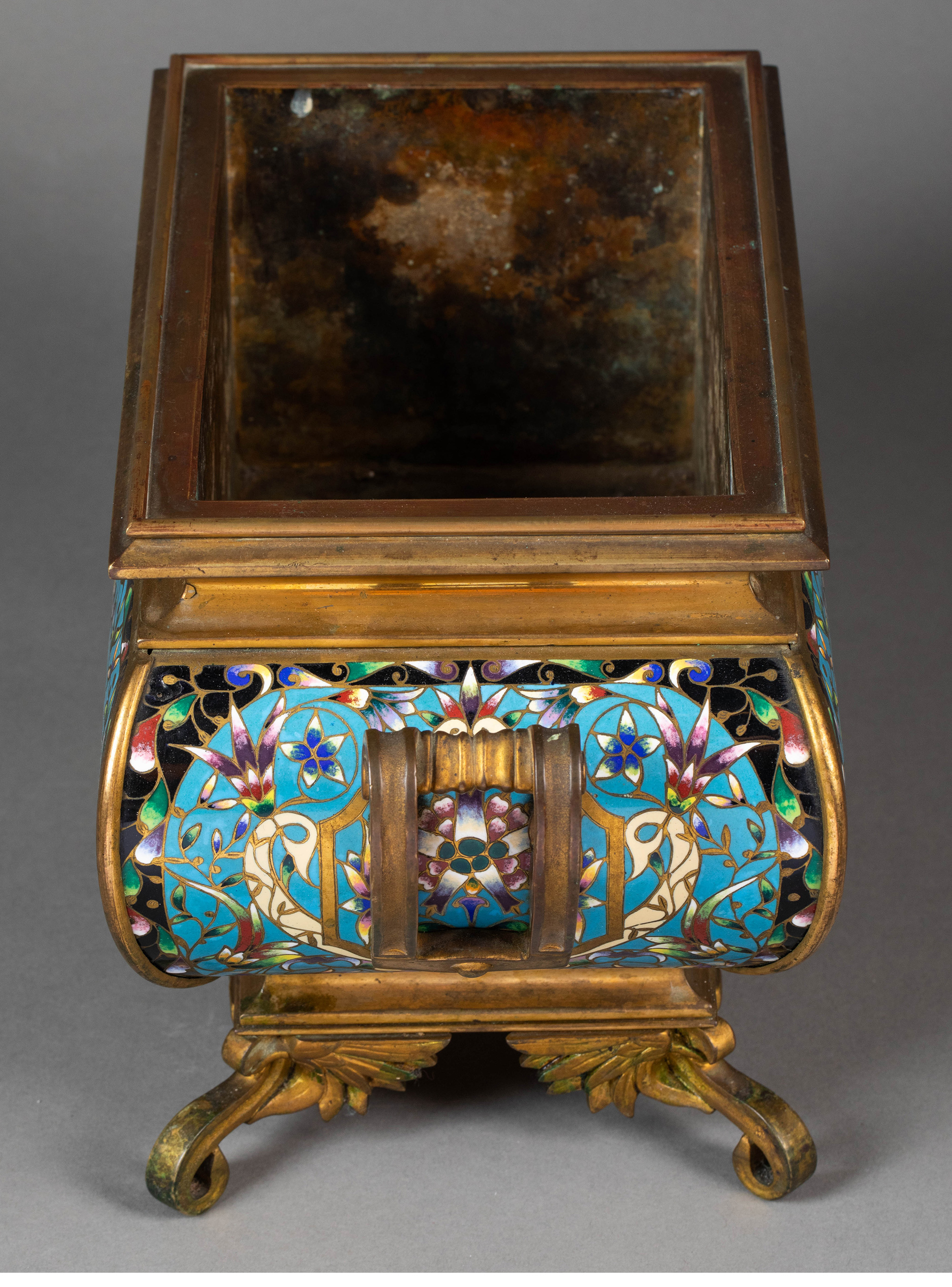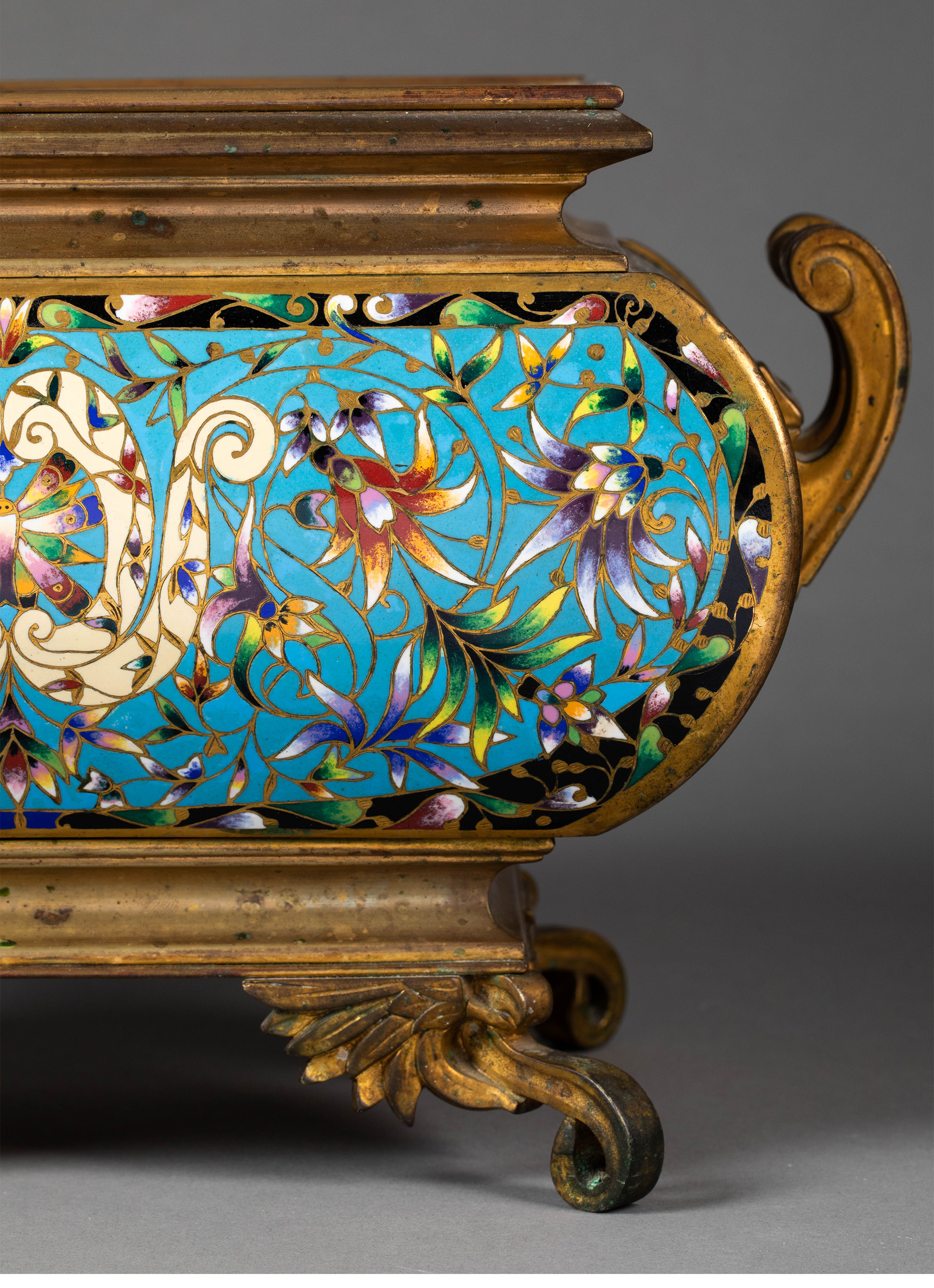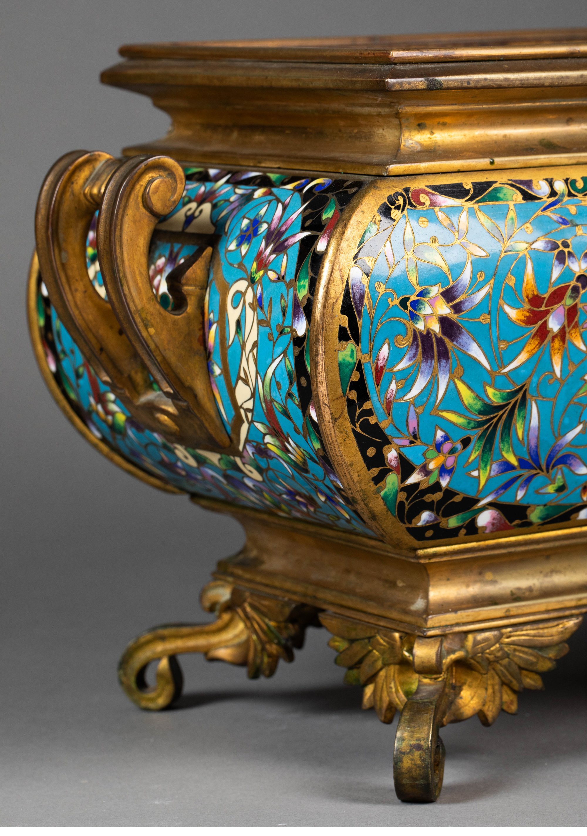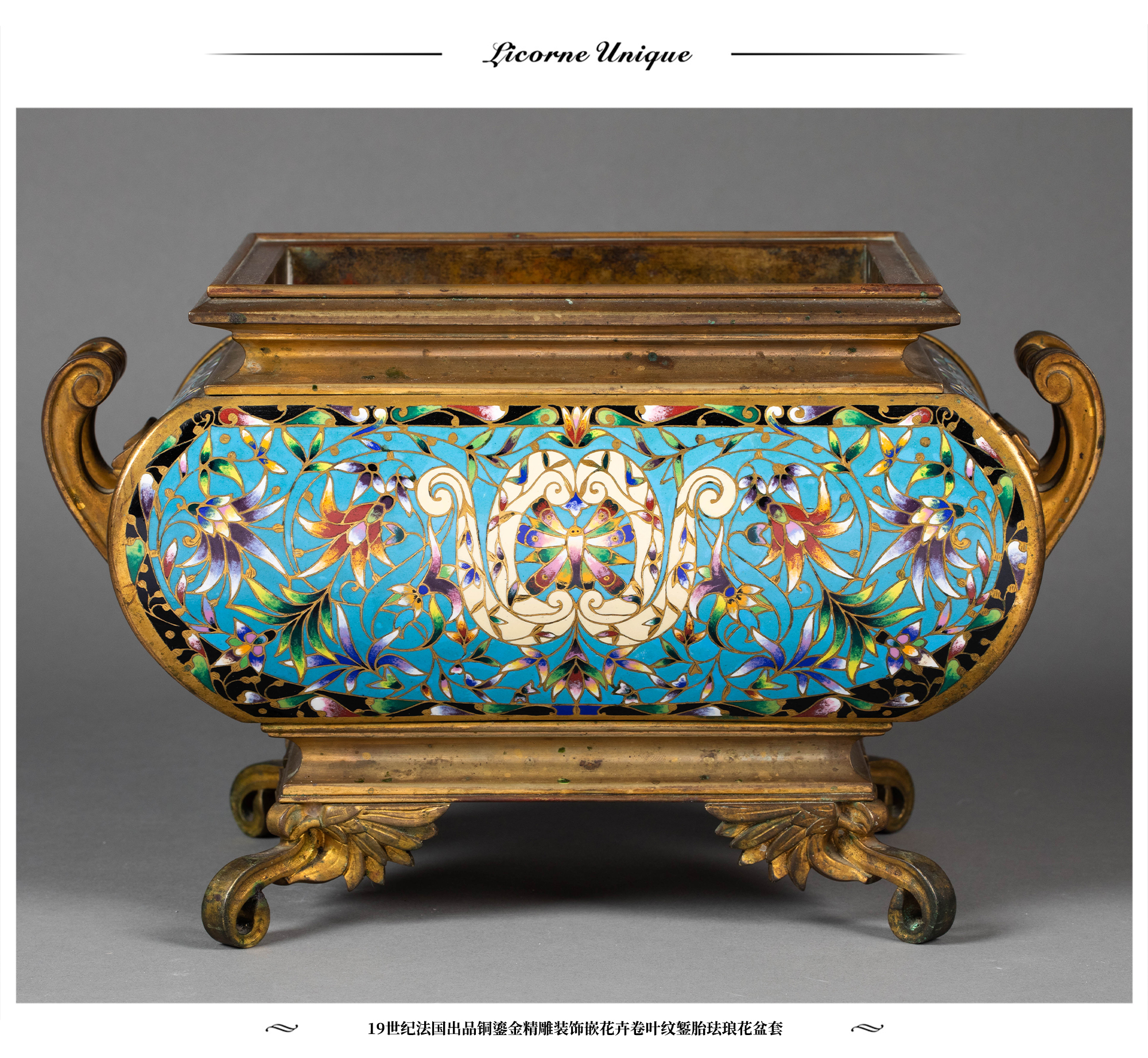 19世纪法国出品铜鎏金精雕装饰嵌花卉卷叶纹画珐琅花盆套