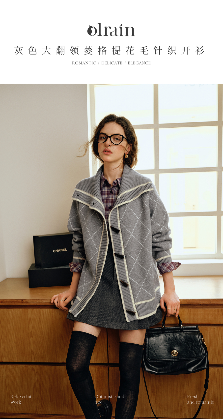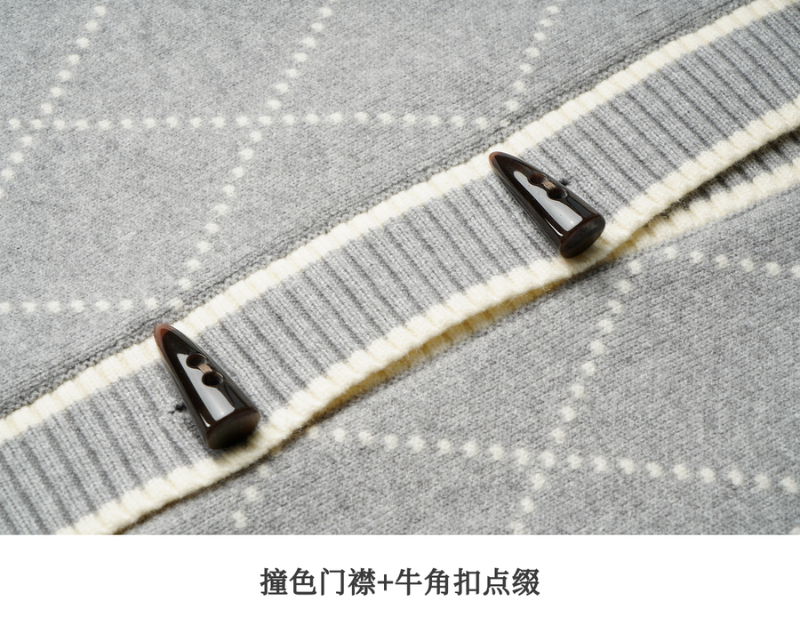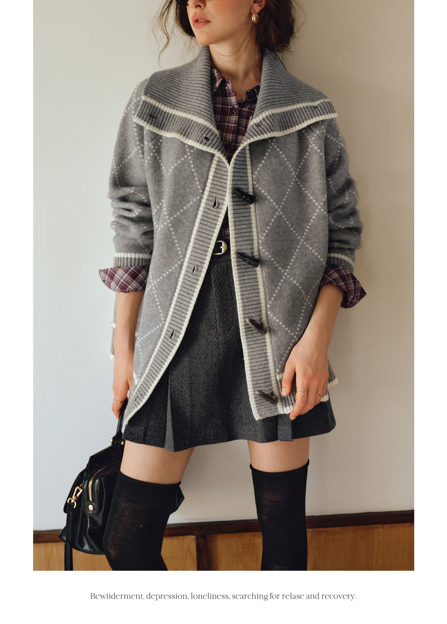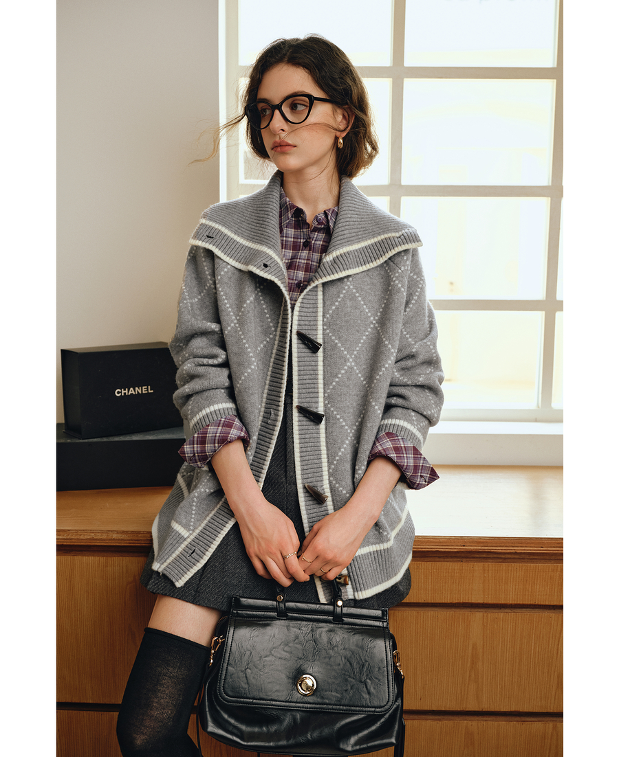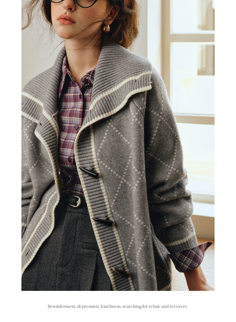 OLrain欧芮儿2025新款女秋季灰色大翻领菱格提花毛针织开衫上衣