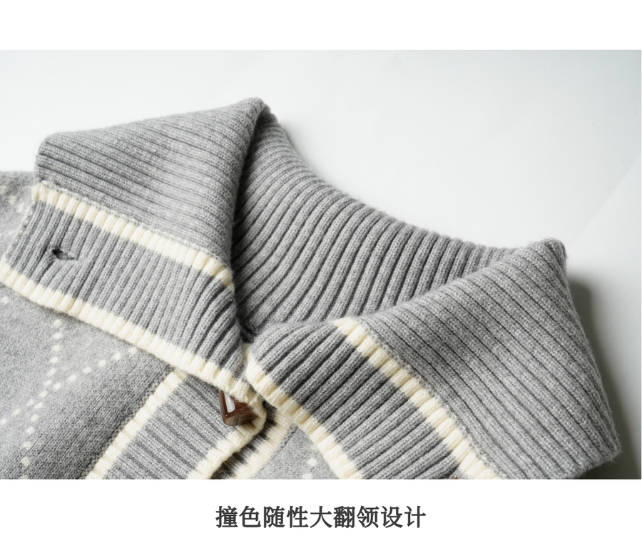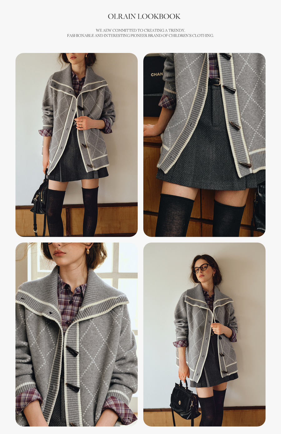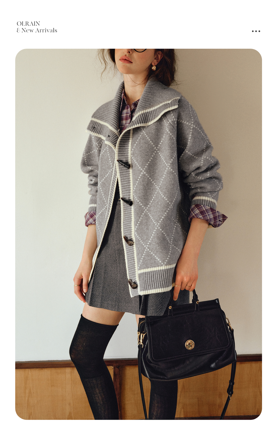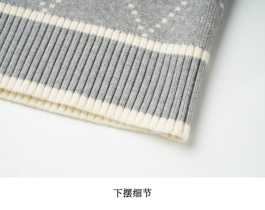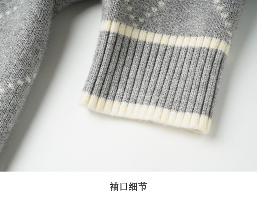 OLrain欧芮儿2025新款女秋季灰色大翻领菱格提花毛针织开衫上衣