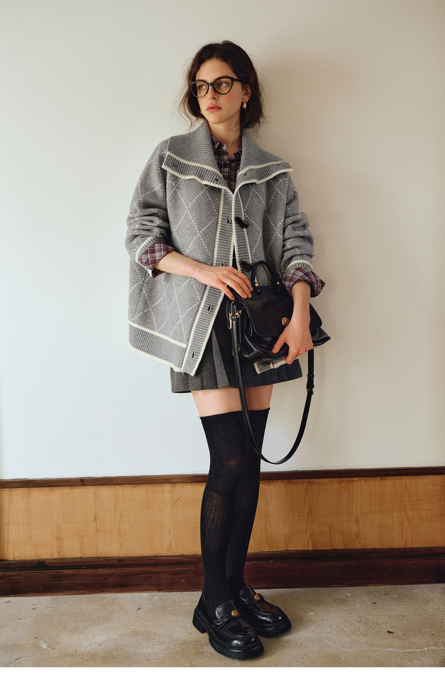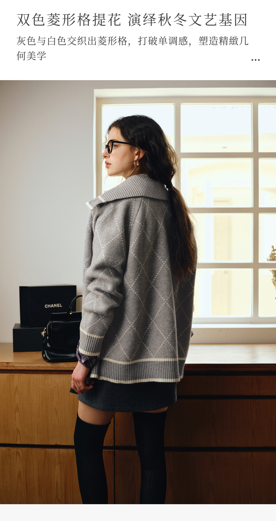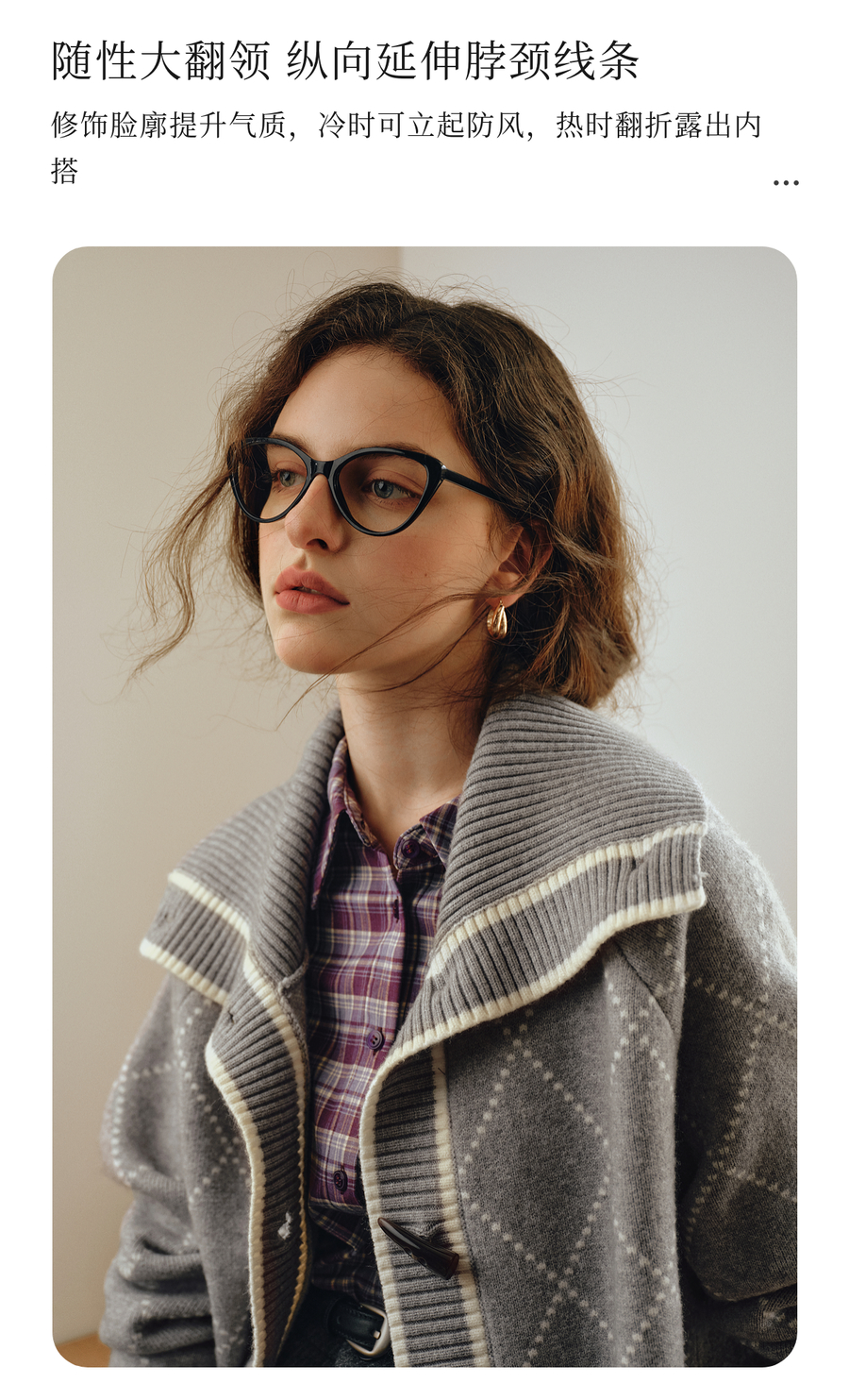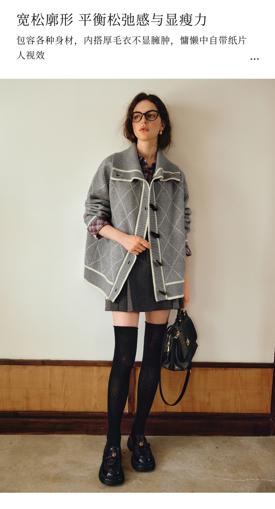 OLrain欧芮儿2025新款女秋季灰色大翻领菱格提花毛针织开衫上衣