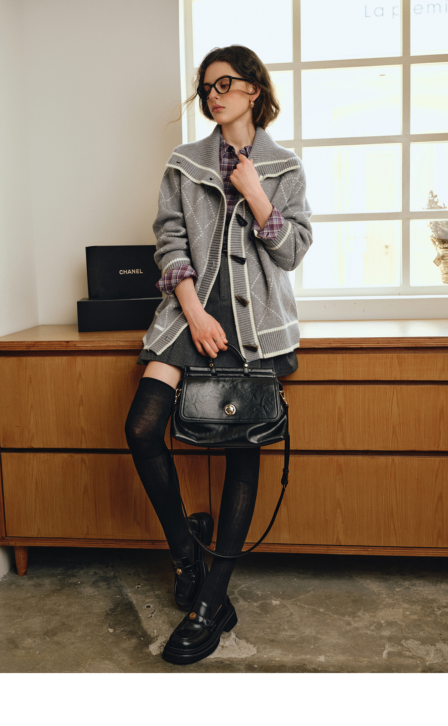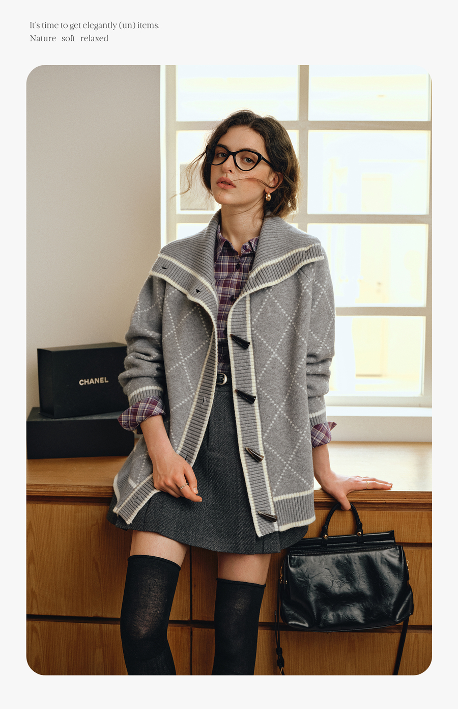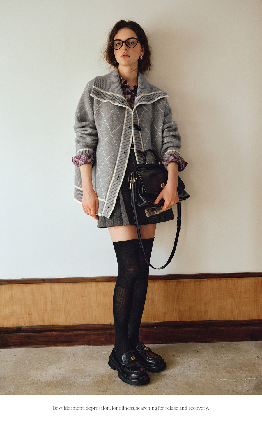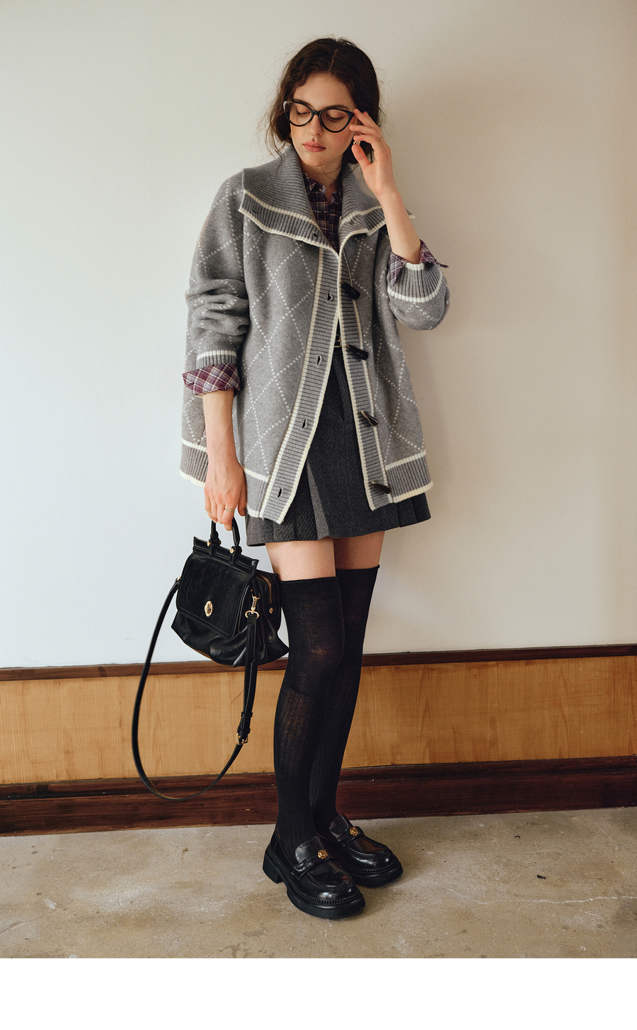 OLrain欧芮儿2025新款女秋季灰色大翻领菱格提花毛针织开衫上衣