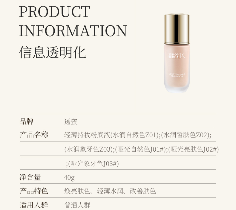 【蜜家特惠丨第2件20元】[拍2瓶送美妆蛋1个]透蜜 轻薄持妆粉底液40g (新旧款随机发货)妆养合一高滋养不闷痘