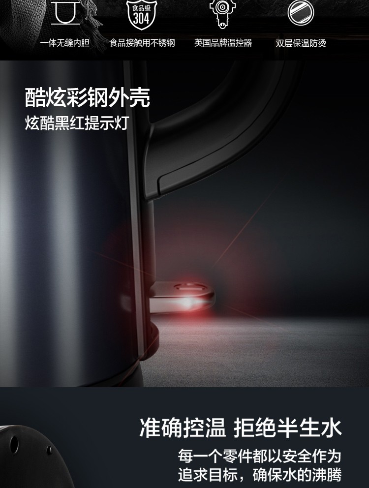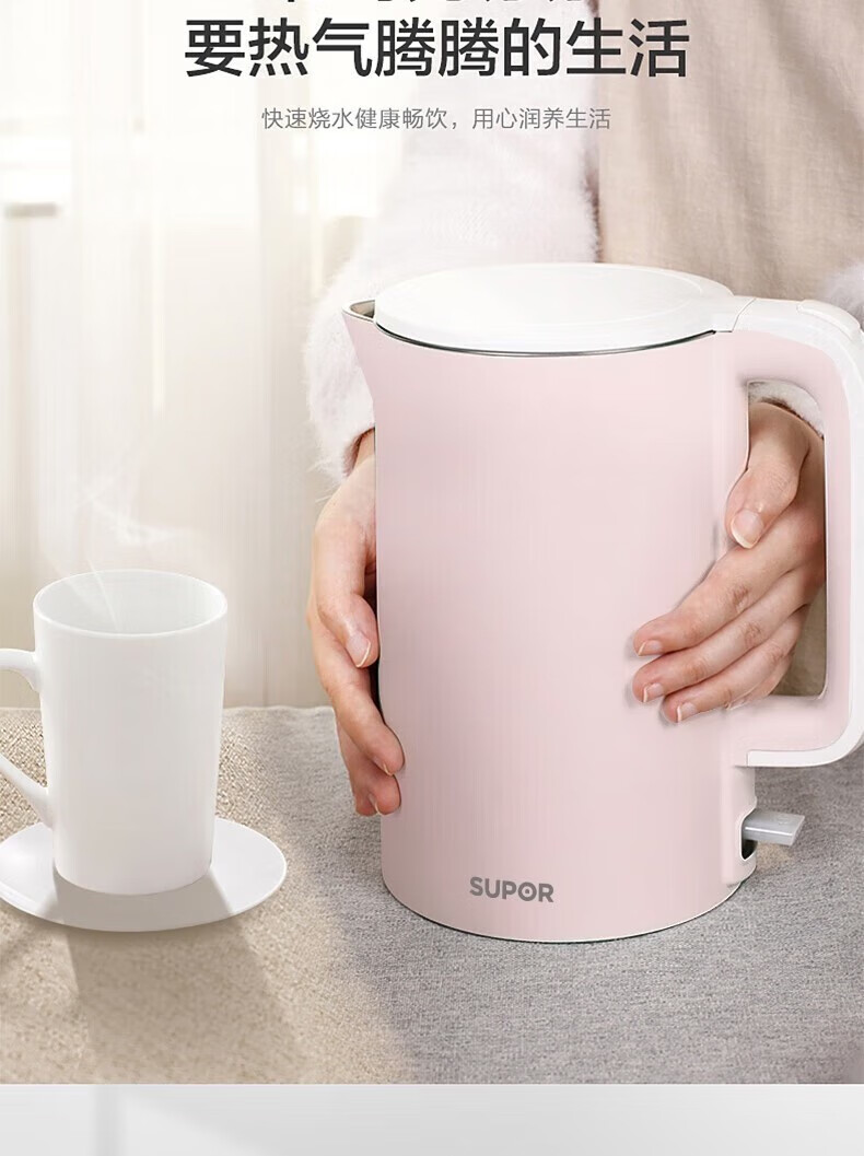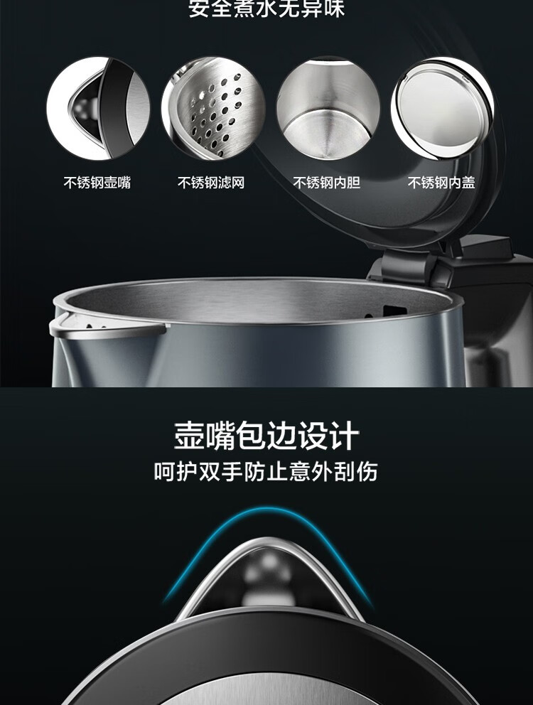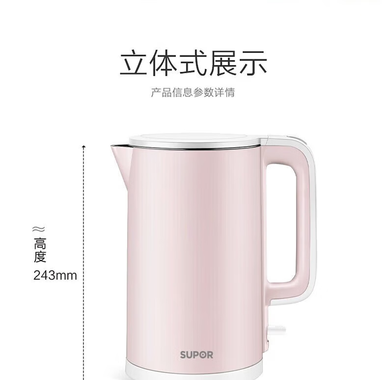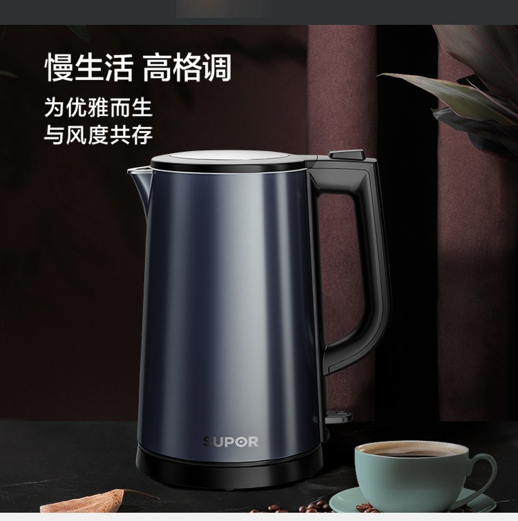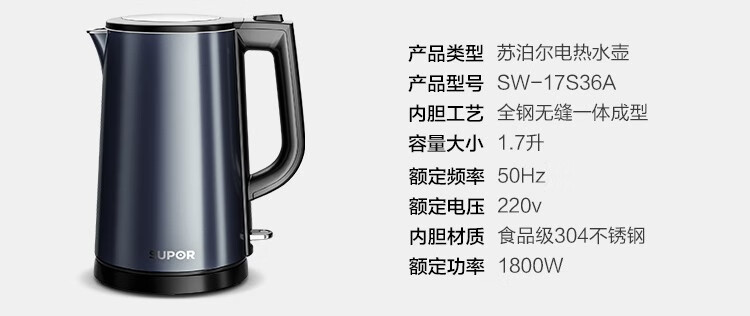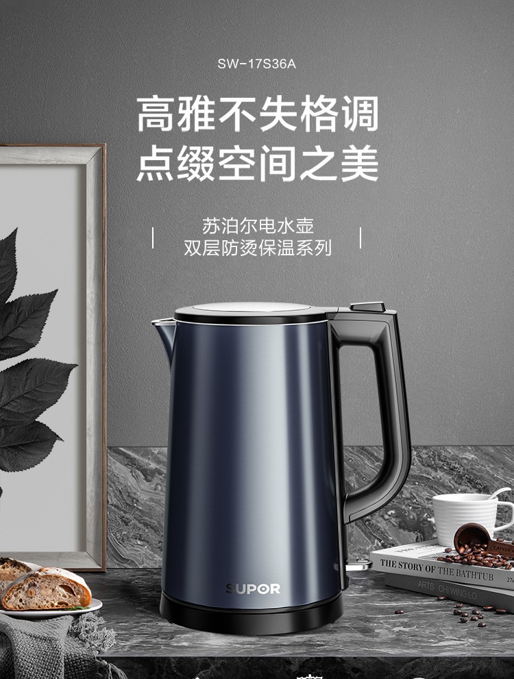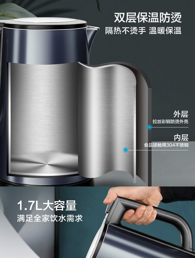 苏泊尔(SUPOR)电热水壶水壶家用1.7L大容量双层保温炫酷彩钢防烫烧水壶开水壶 SW-17S36A