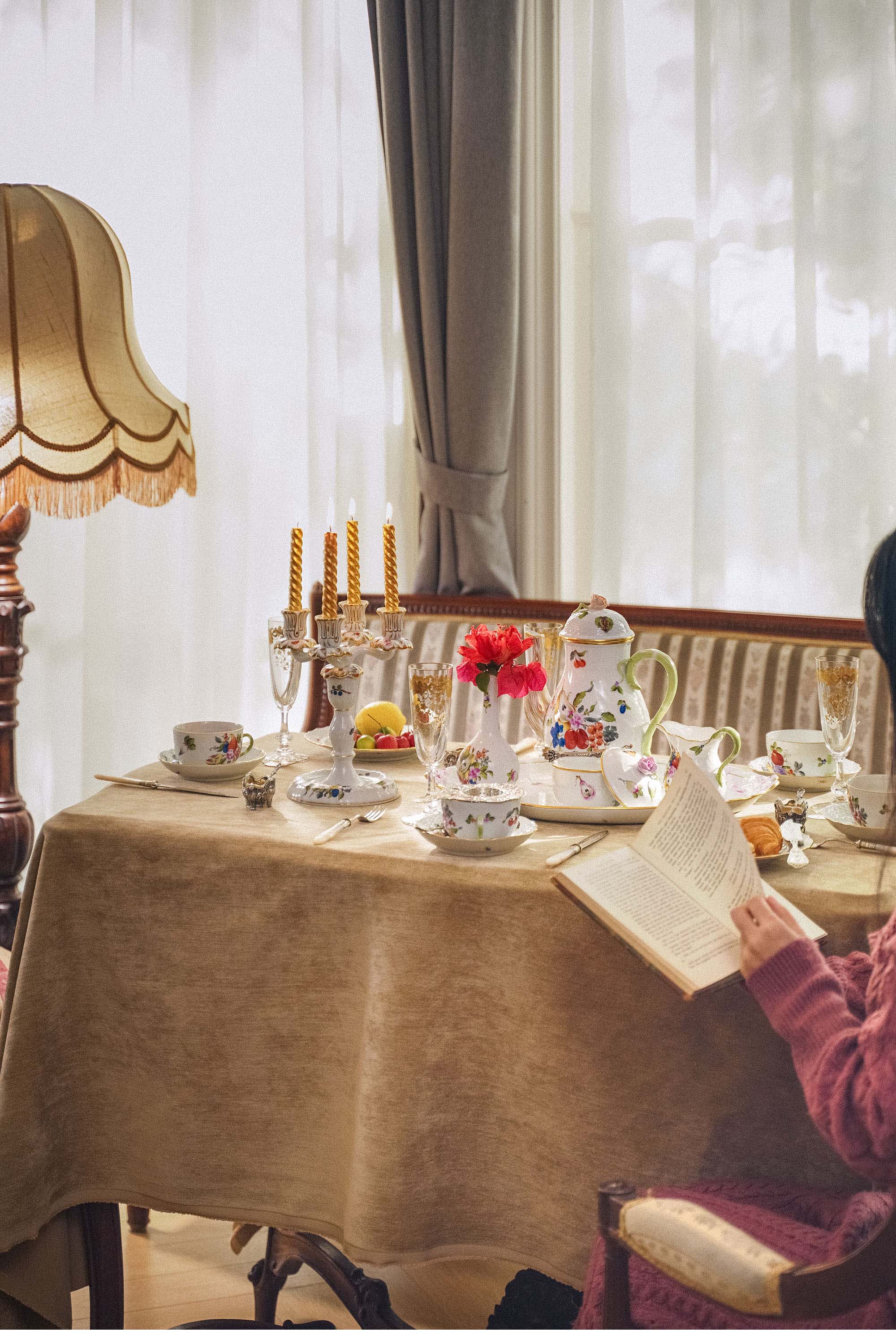 尺寸:托盘长41厘米,宽30厘米;咖啡壶高23.5厘米,宽19厘米;长颈花瓶高14.5厘米;可变式烛台高22.5厘米;咖啡杯杯径9.5厘米,高5.5厘米(4件);杯托直径13.5厘米(4件);甜点盘直径18.5厘米(4件);糖罐高10厘米,长9厘米;奶壶高10厘米,最长11.5厘米