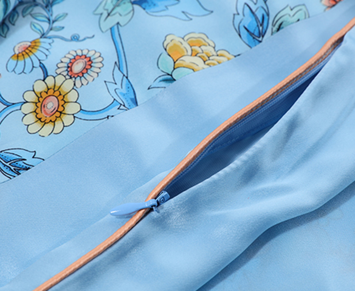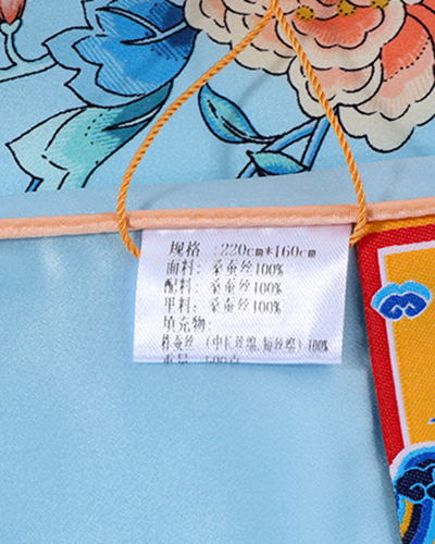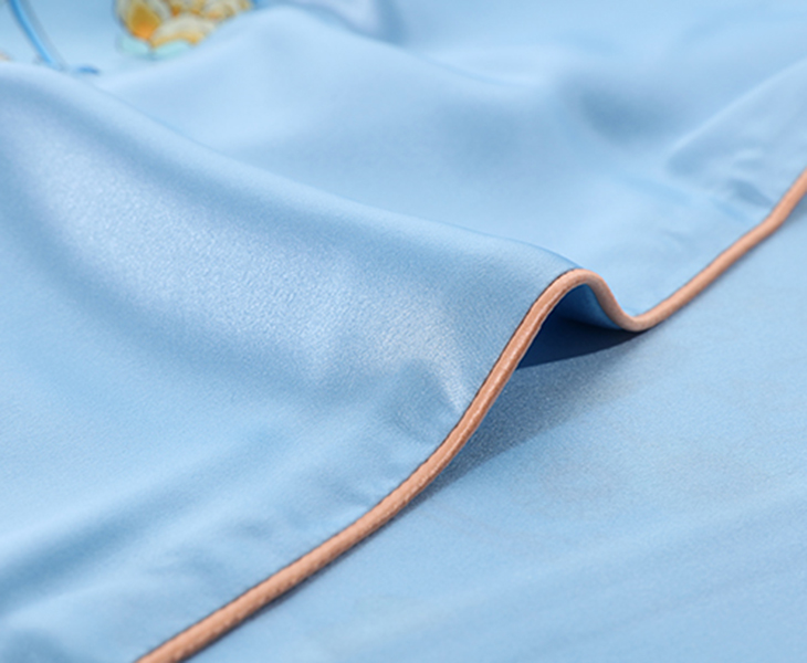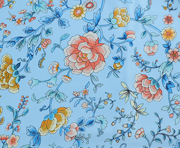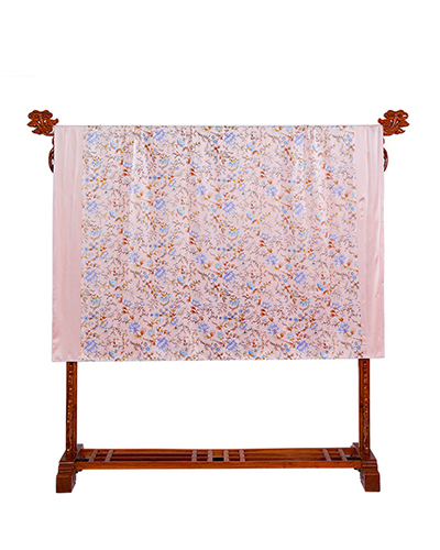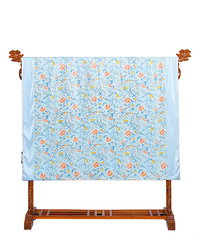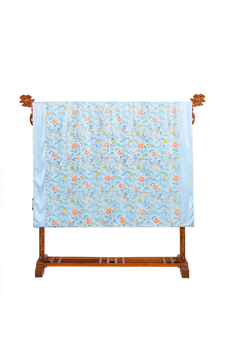 采用柔滑轻盈的桑蚕丝面料,搭配繁花似锦印花,整体布局均衡大气,寓意美好。