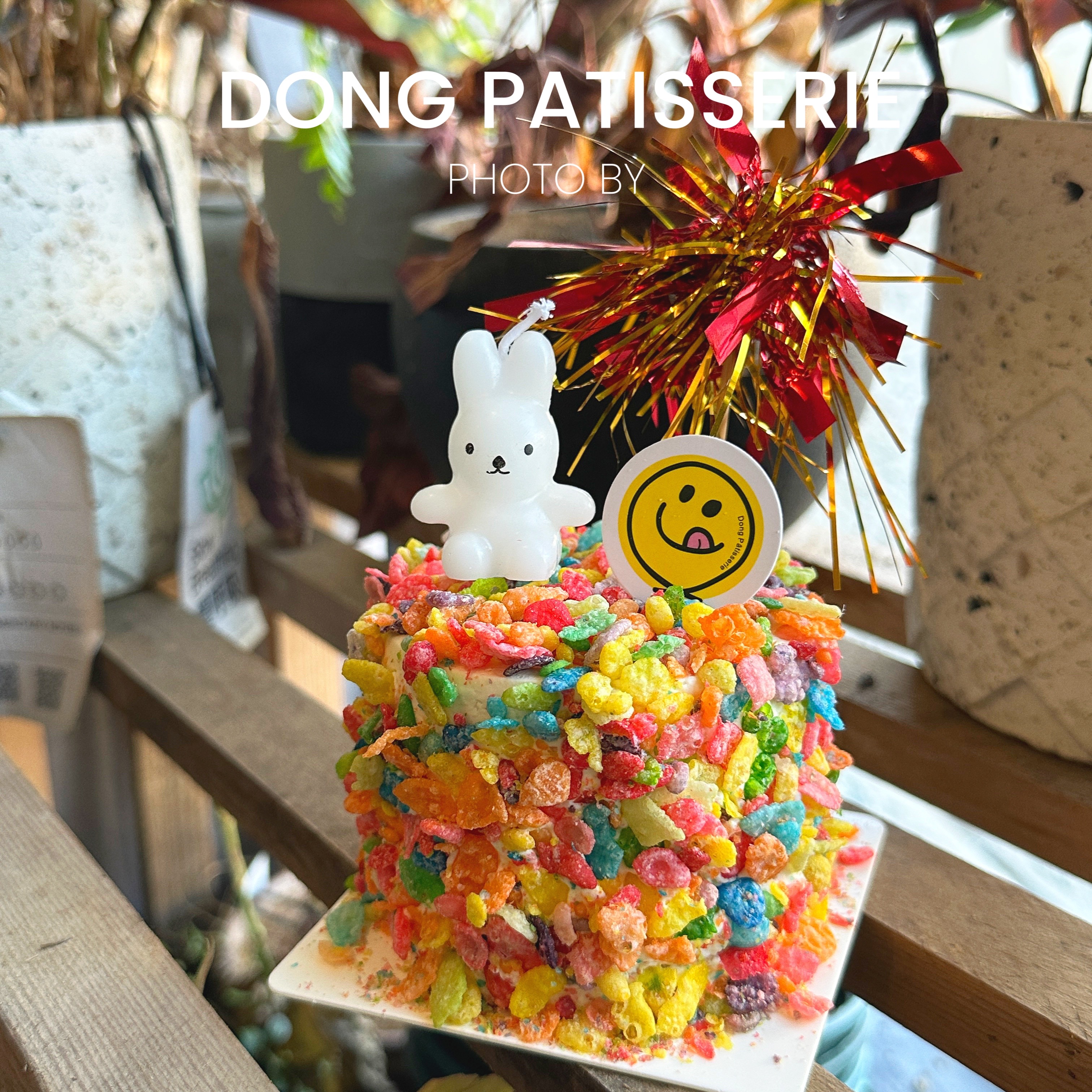 香甜奶油蛋糕上撒满彩虹般的水果麦片