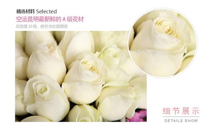 白玫瑰33枝,粉色勿忘我围绕
