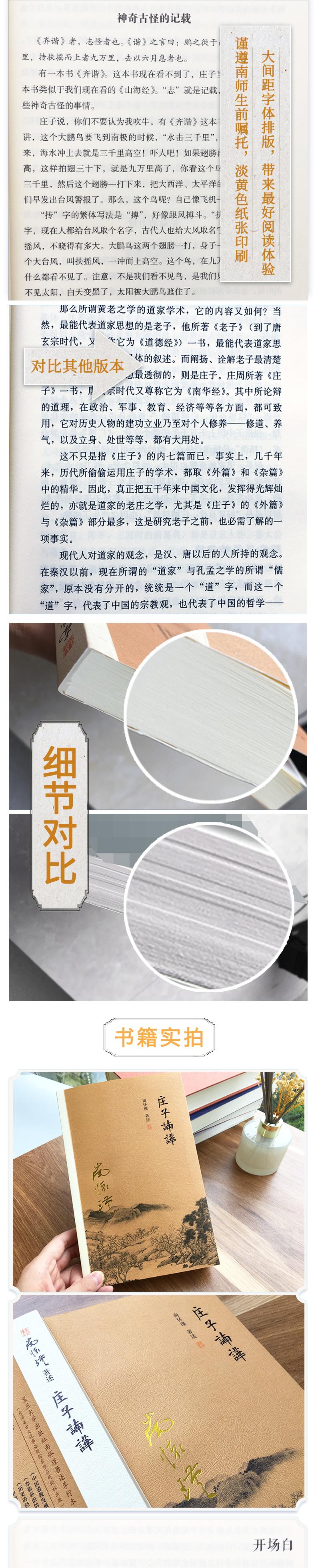 《庄子》一书记载了庄子本人及其门人后学的思想言行,是道家的代表作品。自魏晋以降,其影响力更是跨越道家范囿,与儒、释等学术流派相结合,成为中国传统士人修身应世必读之书,其中尤以《内篇》七篇,因严密的思想体系和恣肆的文风向来为人所称。历代有关《庄子》的注疏之作也是如缕不绝。南怀瑾以融贯中西的学术视野及其通透灵动的人生感悟,上下古今、广征博引中国各类典籍,并参照西方宗教思想,撰成《庄子諵譁》一书,对《庄子》内篇进行了逐句讲解。全书透过《庄子》看似突兀跳荡的行文,为我们展示了其中清晰的内在思想脉络,是当下读者了解《庄子》的优良入门读本。