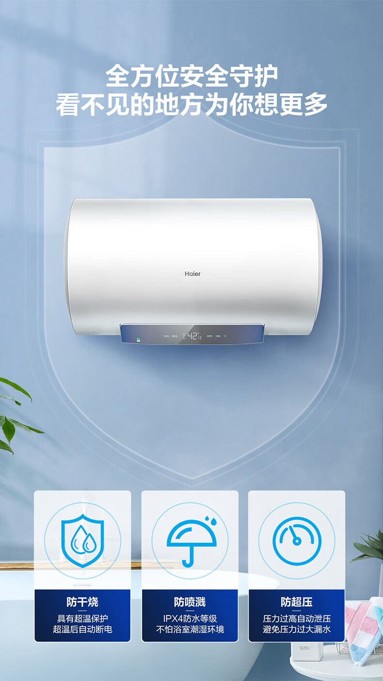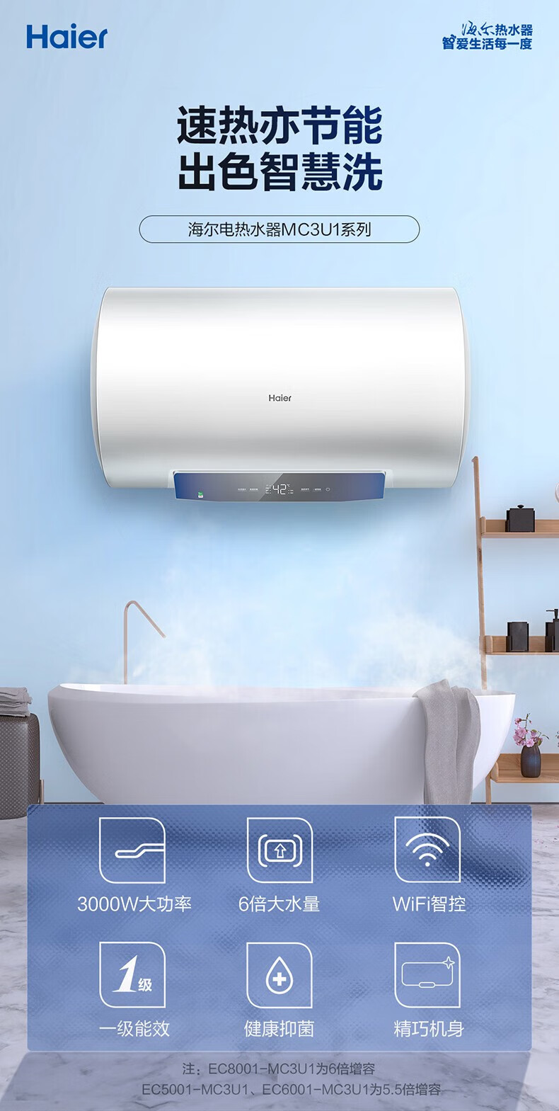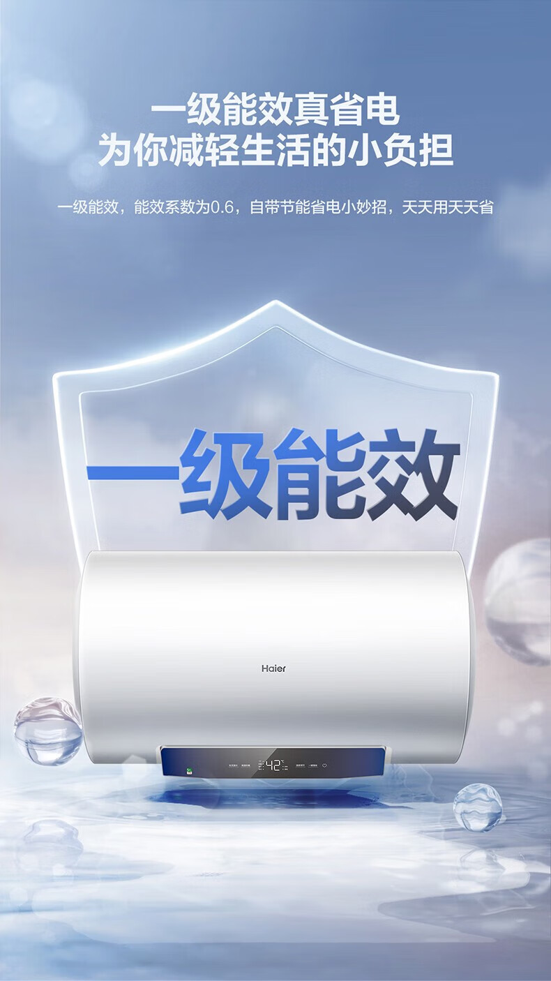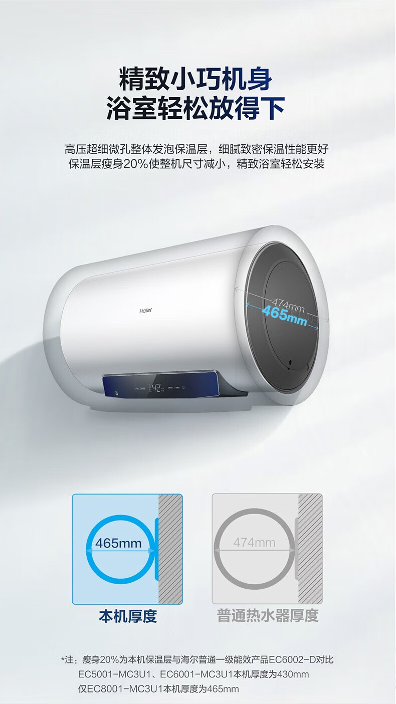 海尔(Haier)80升家用储水式电热水器镁棒免更换即热速热恒温一级能效节能省电保温智能洗澡MC3系列 80L 3000W EC8001-MC3U1