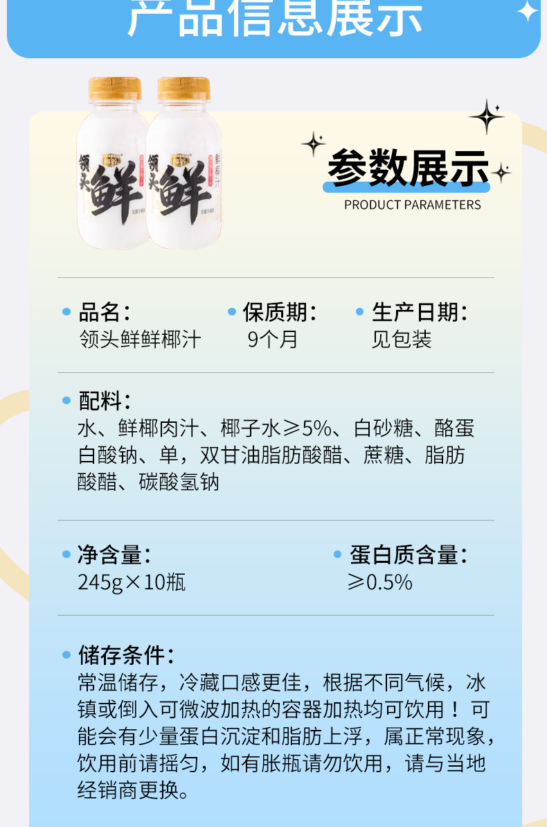 品名:鲜椰汁 规格:245g/瓶发货地/产地:湖南、广东、广西等多仓随机/广东