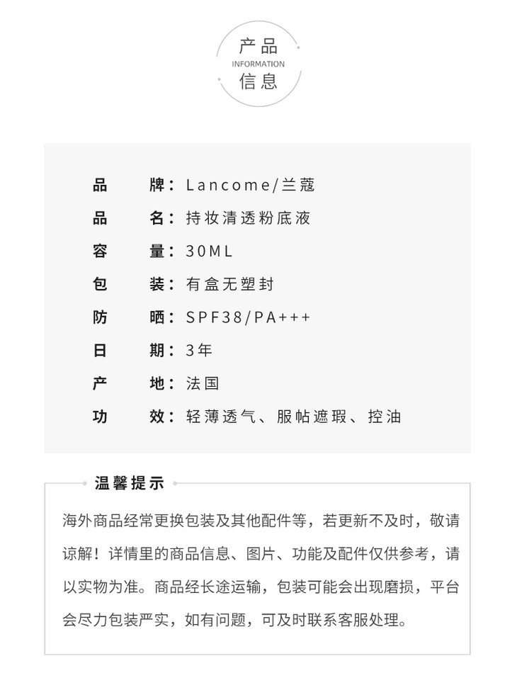 兰蔻持妆粉底液 PO-01象牙白自然粉调 轻薄持妆不闷痘持久遮瑕SPF38/PA+++ 30ml LANCÔME/lancome