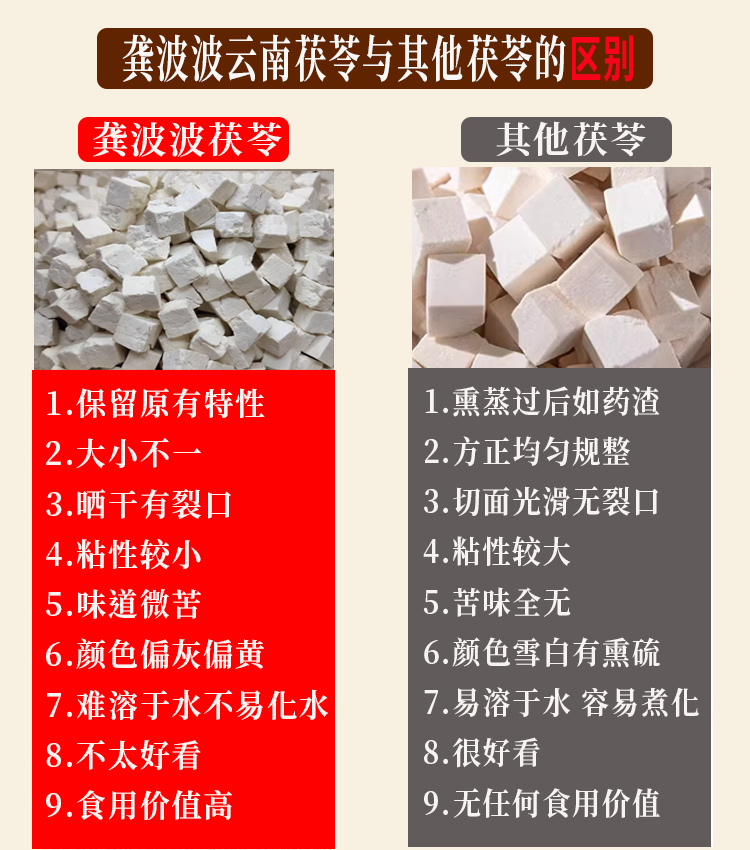 由于杜绝使用硫磺熏制,外观上可能没有熏制过的好看,切莫用颜值去评定产品的好坏,我们只做云南哀牢山的茯苓,原产地,更正宗。