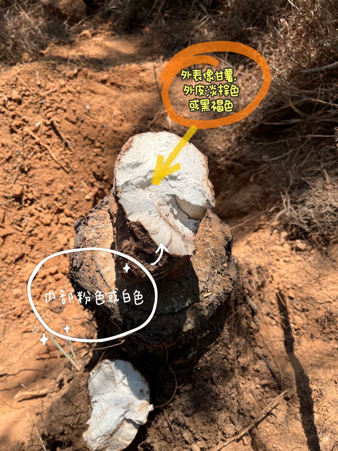 采挖后新鲜的茯苓形如甘薯,球状,外皮淡棕色或黑褐色,内部粉色或白色。